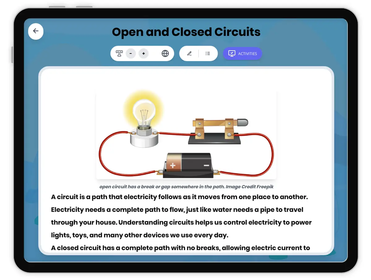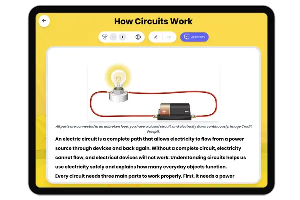 This engaging 250-word reading passage teaches Grade 4-5 students about open and closed circuits, aligned with NGSS 4-PS3-2 science standards. Students learn how closed circuits have complete paths that allow current to flow, while open circuits have breaks that stop current flow. The passage explains how switches work by opening and closing circuits to control when electrical devices turn on and off, using the familiar example of a light switch. Audio-integrated content includes concrete examples like flashlights and doorbells to help students understand abstract electrical concepts. The passage uses age-appropriate vocabulary while introducing key scientific terms such as circuit, current flow, switch, and circuit breaks. Students explore cause-and-effect relationships and discover why complete paths are essential for electricity to work. Supplementary activities include multiple-choice questions testing recall and comprehension, writing prompts requiring students to explain concepts and apply knowledge, and graphic organizers comparing open and closed circuits. A simplified differentiated version supports diverse learners, and Spanish translations make the content accessible to bilingual students. This comprehensive resource helps elementary students build foundational understanding of electrical circuits through clear explanations and relatable examples.