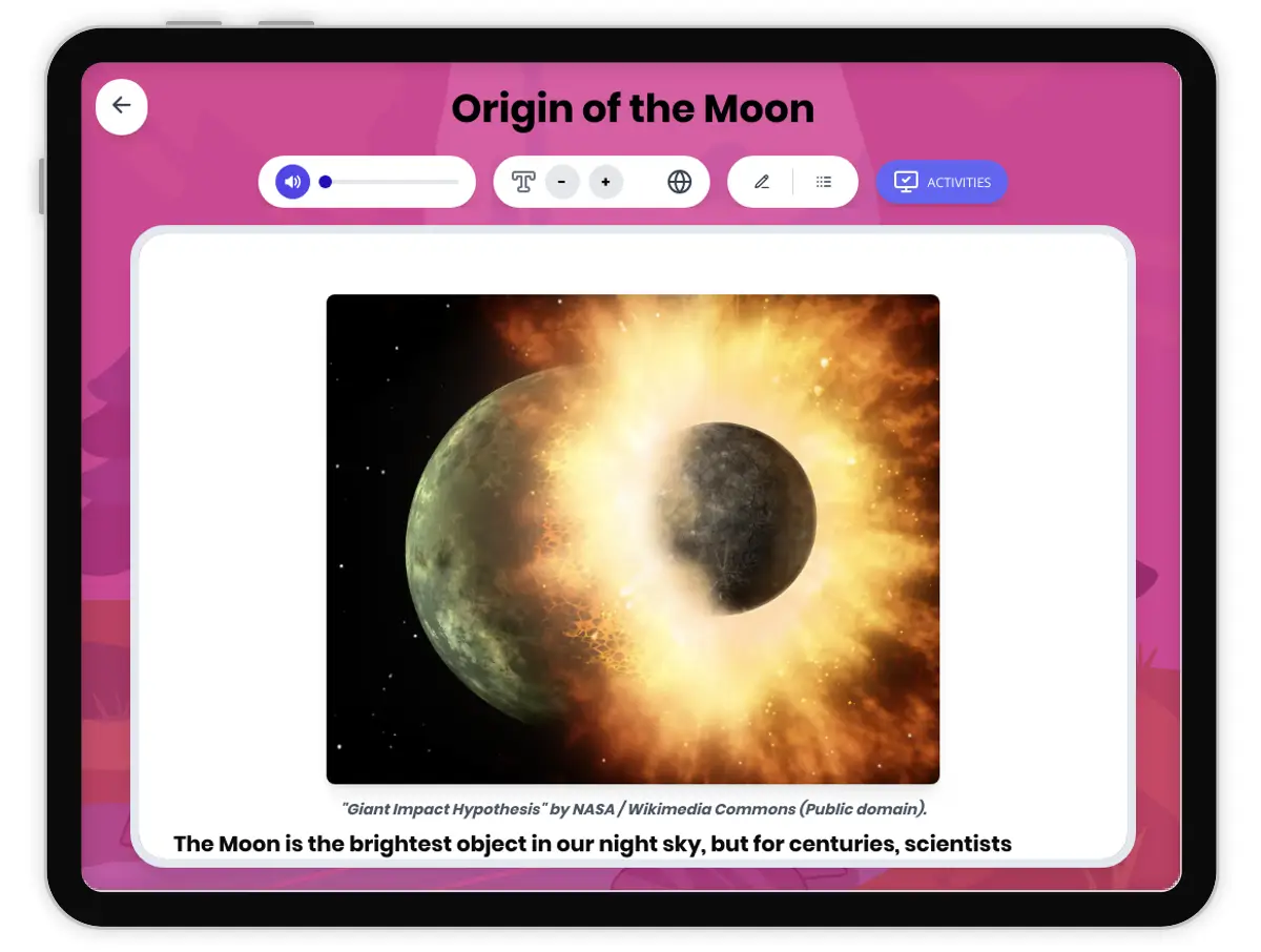 This comprehensive middle school science passage explores the widely accepted giant impact hypothesis for the Moon’s origin, aligned to NGSS standard MS-ESS1-2. Students will learn how a collision between early Earth and a Mars-sized object (Theia) led to the Moon’s formation from debris. The passage details the scientific evidence, including lunar rock composition and computer simulations, and discusses why rival theories are rejected. Real-world implications connect the Moon’s formation to understanding Earth's geological history. Key academic vocabulary is highlighted and defined. The resource includes a Spanish translation, a leveled version for struggling readers, and multiple activities—such as quizzes, writing prompts, and graphic organizers—to build analytical and scientific reasoning skills. This passage is ideal for science classrooms and is audio integrated for accessibility.