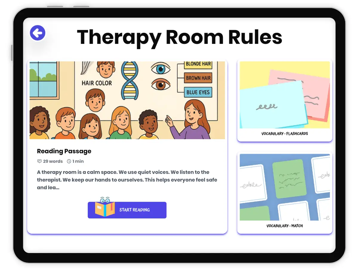 This educational reading passage introduces first-grade students to appropriate behavior in a therapy room setting. The content teaches children to use quiet voices, listen to the therapist, keep hands to themselves, and understand how these actions help everyone feel safe and learn. The passage supports social-emotional development by establishing clear expectations for calm, respectful behavior in therapeutic environments.