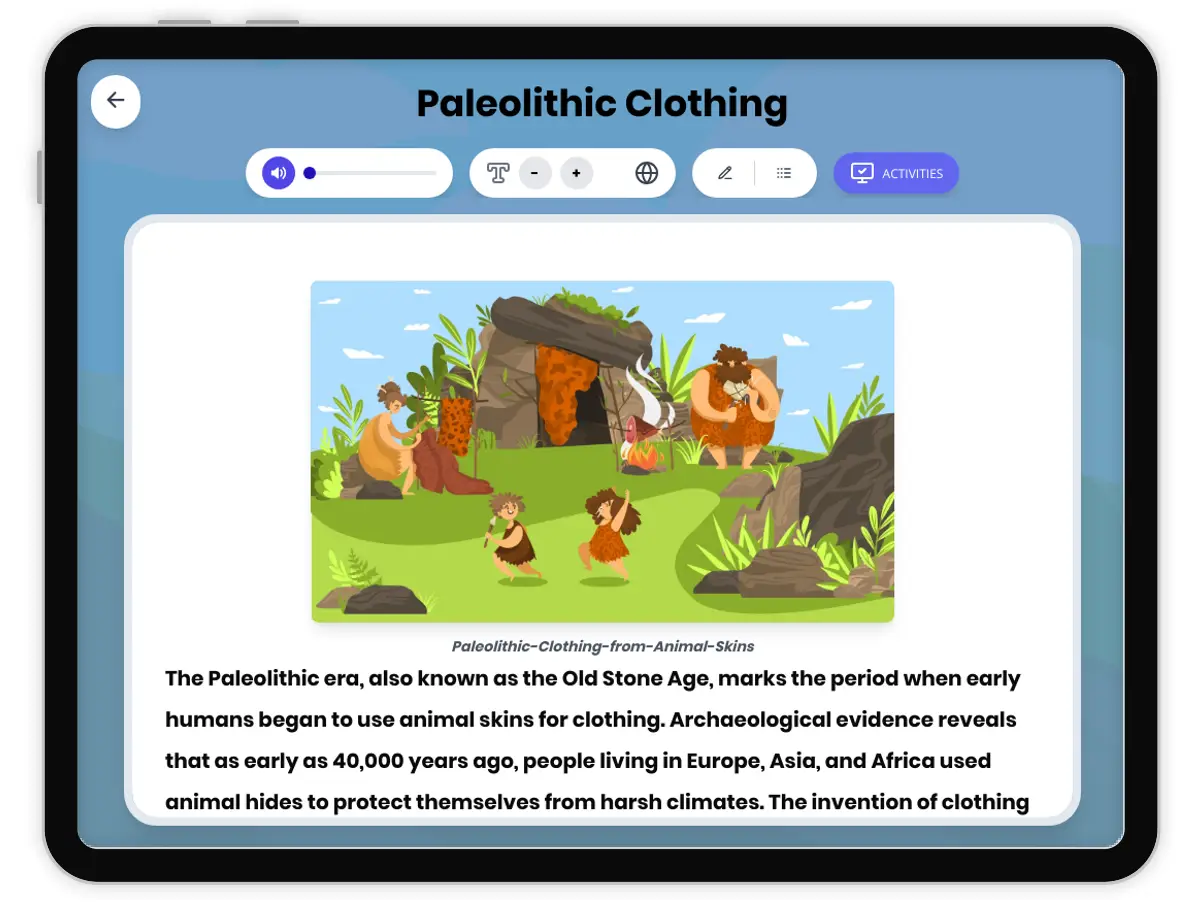 This passage explores the fascinating world of Paleolithic clothing, focusing on how early humans used animal skins and bone needles to survive harsh environments. Students will learn about archaeological discoveries, technological innovations, and the social significance of clothing in prehistoric societies. The passage is aligned with CA HSS 6.1 and CCSS RH.6-8.1 standards, ensuring rigorous historical and ELA skills development. The resource includes a detailed reading passage, glossary, multiple-choice quiz, writing activities, graphic organizers, a timeline, and Spanish translations. Read aloud audio and a relevant public domain image enrich the learning experience, making it suitable for diverse learners. This comprehensive educational tool helps students analyze history through evidence, understand cause and effect, and connect past innovations to broader human development.