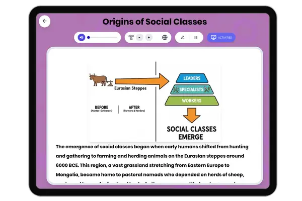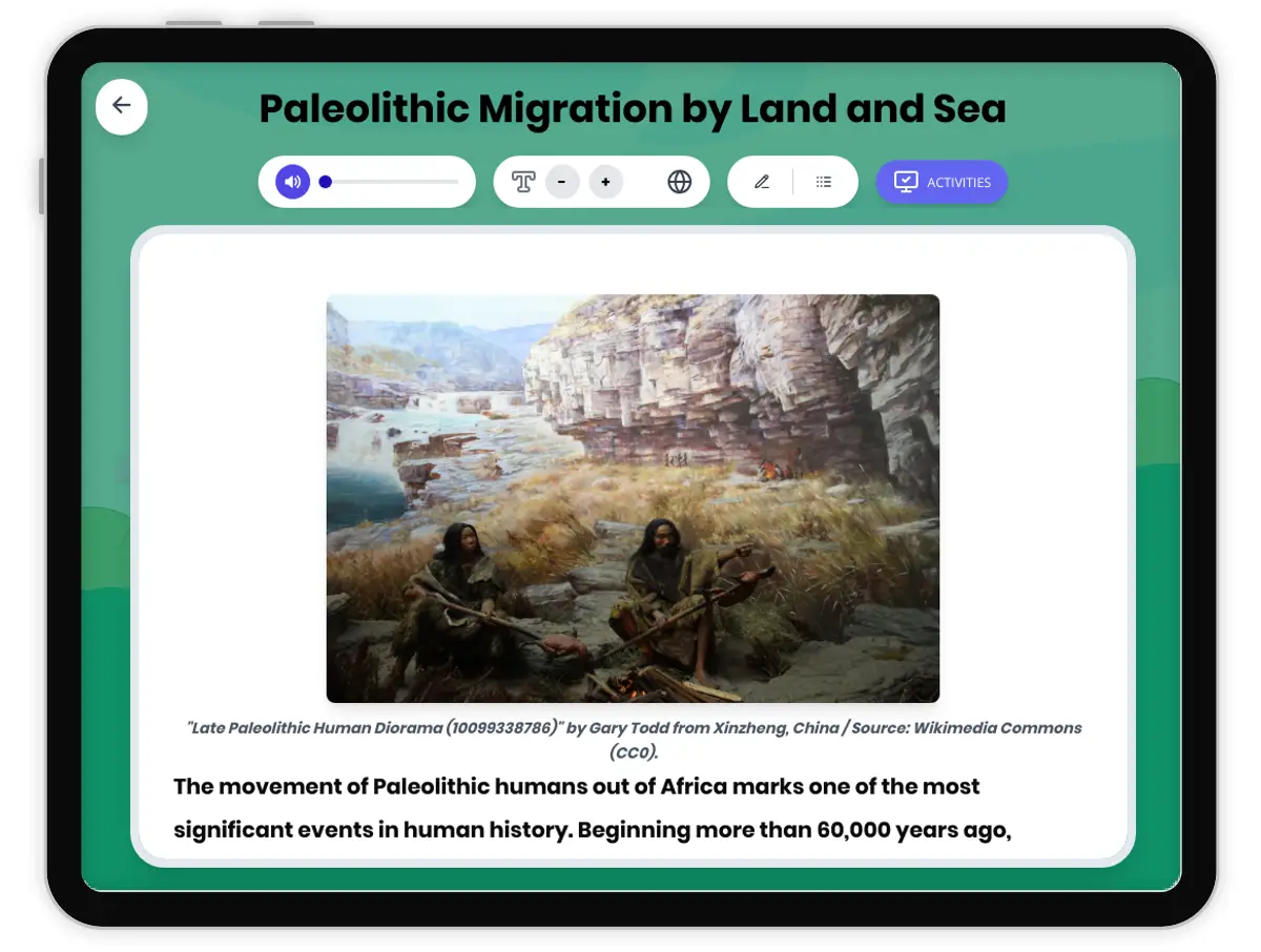 This passage explores the migration of Paleolithic humans from Africa to the rest of the world, focusing on the routes they took, the use of land bridges like Beringia, and the timeline of their arrival on different continents. Students will encounter archaeological evidence, the challenges faced by early humans, and the impact of these migrations on human development. The passage aligns with California HSS 6.1 and CCSS RH.6-8.1 standards, supporting historical and literacy skills. Interactive activities include a multiple-choice quiz, writing prompts, graphic organizers, and a timeline. Both English and Spanish versions are available, along with a simplified text for accessibility. Includes read aloud audio, glossary, and relevant questions for critical thinking. Ideal for studying ancient human migration and adaptation.