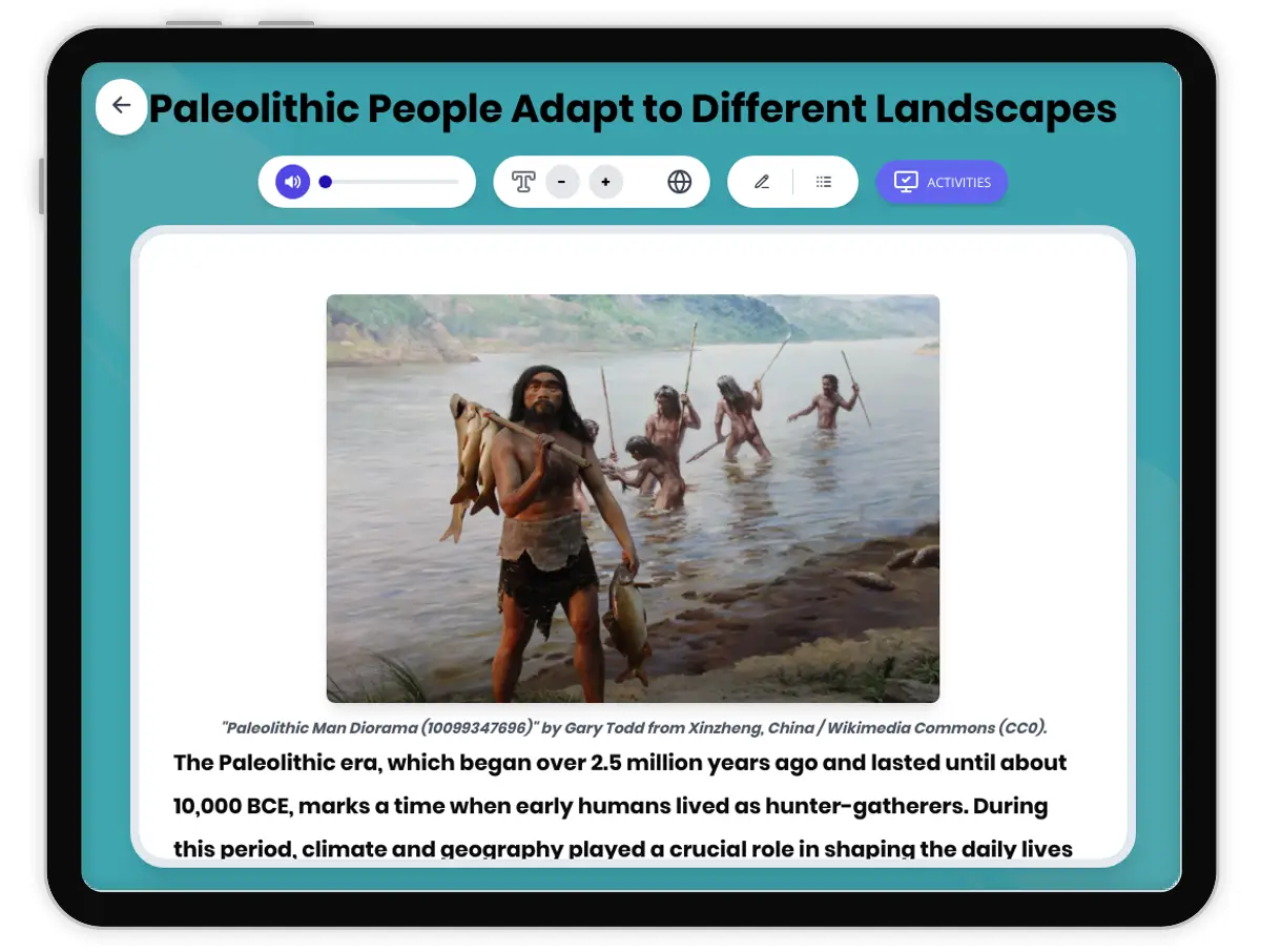 This passage explores how Paleolithic people adapted to a variety of landscapes, including coastal regions, mountains, plains, and forests, shaping their daily lives through fishing, hunting, gathering, and building shelters. Archaeological evidence, such as cave art and tools, provides insight into their survival strategies and social organization. The passage aligns with CA HSS 6.1 and CCSS RH.6-8.1 standards, promoting historical analysis and comprehension. Activities include a multiple-choice quiz, writing prompts, graphic organizers, glossary, and a timeline. Read aloud audio and a full Spanish translation are provided to support diverse learners. This engaging history reading passage helps students understand the relationship between geography and human adaptation in early history.