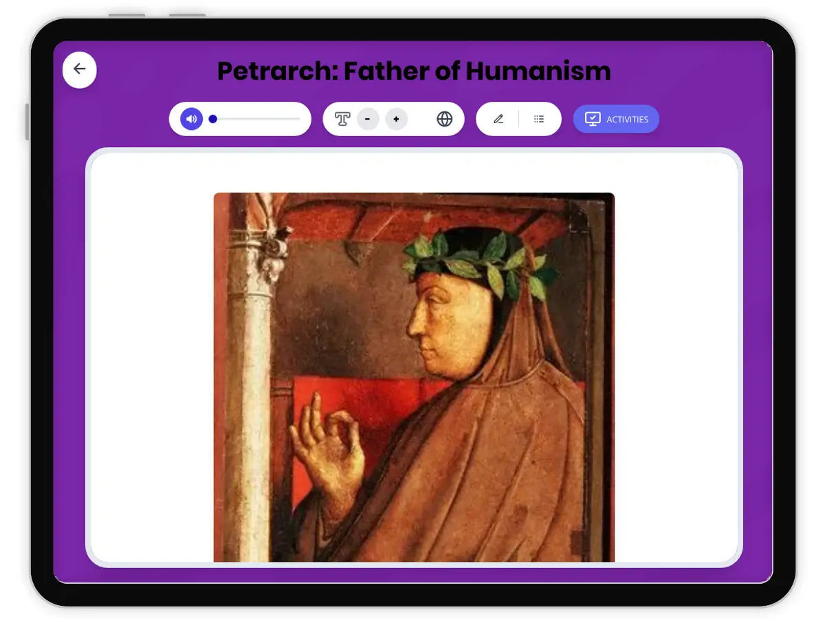 This rigorous world history reading passage introduces students to Francesco Petrarch, known as the Father of Humanism, and his pivotal role in the European Renaissance. Students will learn how Petrarch revived interest in ancient Greek and Roman texts, contributed to new literary forms, and helped inspire a movement that valued the study of humanity and individual thought. The passage includes key vocabulary, multiple examples from historical sources, and explains the impact of Petrarch's work on later thinkers, art, and literature. Activities include a multiple-choice quiz, writing prompts, graphic organizers, and a timeline for deeper analysis. Spanish translation and read aloud audio are included. This passage aligns with CA HSS 7.8 and CCSS RI.6.3, providing both rigorous historical content and ELA skill-building for middle school classrooms.
