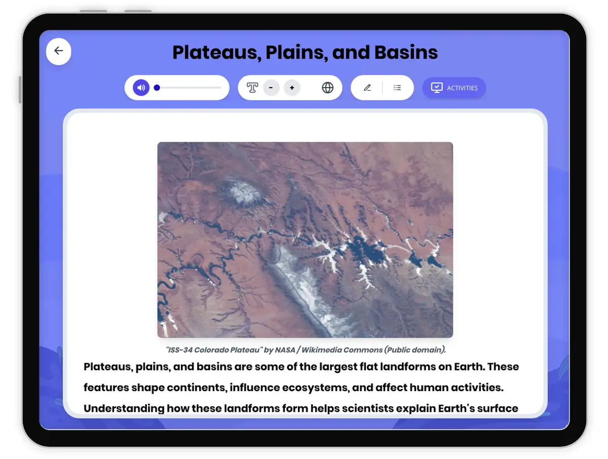 This comprehensive science reading passage for grades 6-8 introduces students to plateaus, plains, and basins—three major types of large, flat landforms found on Earth's surface. The passage meets NGSS standard MS-ESS2-1, covering the mechanisms of formation, including volcanic activity, tectonic uplift, sediment deposition, and erosion. Real-world examples such as the Columbia Plateau, Great Plains, and Great Basin illustrate these processes. Students will explore the interconnectedness of Earth's systems, analyze cause-and-effect relationships in geology, and develop vocabulary with an embedded glossary. Activities include multiple-choice questions, writing prompts, and graphic organizers, supporting both comprehension and critical thinking. The passage is available in both standard and differentiated versions, with Spanish translations to support diverse learners. Audio integration enhances accessibility, making this resource ideal for use in classroom instruction, homework, or independent study.