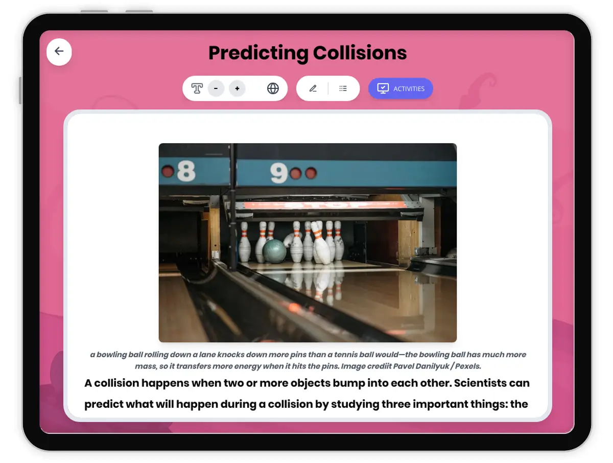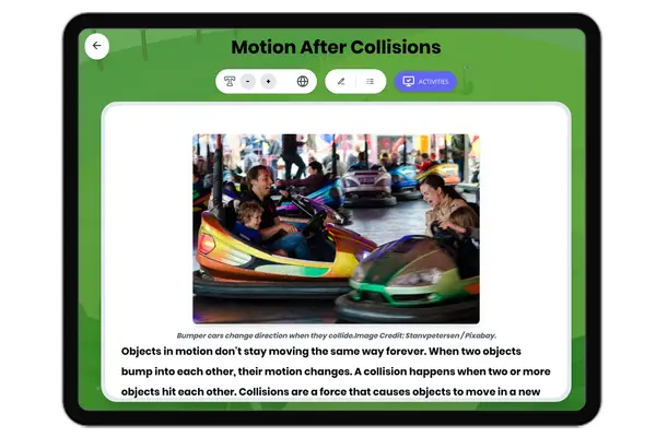 This engaging 250-word science passage helps Grade 4-5 students understand how scientists predict collision outcomes by analyzing speed, mass, and direction of moving objects. Aligned with NGSS standard 4-PS3-3, the passage explains how heavier objects and faster objects transfer more energy during collisions, causing bigger changes in motion. Students explore real-world examples like bowling balls knocking down pins and shopping carts bumping together. The passage includes audio integration for enhanced learning accessibility. Activities include a multiple-choice quiz testing scientific facts and comprehension, writing prompts requiring students to explain concepts and apply knowledge, and graphic organizers for analyzing cause-effect relationships and comparing different collision scenarios. A simplified differentiated version ensures all learners can access the content. Spanish translations of both versions support English language learners. The glossary defines key terms like collision, mass, speed, direction, and energy transfer. This comprehensive resource makes abstract physics concepts tangible through familiar examples and clear explanations suitable for upper elementary students.