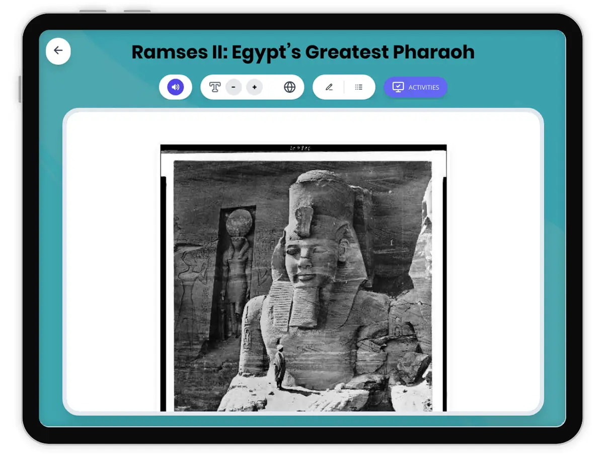 This engaging history reading passage explores the remarkable reign of Ramses II, often called Egypt’s greatest pharaoh. Students will learn about his rise to power, monumental building projects like Abu Simbel, military campaigns such as the Battle of Kadesh, and the significance of his diplomatic achievements. The passage also covers aspects of daily life, social hierarchy, and the lasting legacy of Ramses II in shaping Egypt’s history. Key vocabulary words are highlighted and explained, supporting both ELA and history standards (CA HSS 6.2, CCSS RH.6-8.1). Activities include a multiple-choice quiz, writing prompts, graphic organizers, and a timeline to deepen comprehension. The Spanish translation and read aloud audio make this resource accessible for diverse learners. Use this passage to analyze history like a historian and connect Ancient Egypt’s geography, politics, and culture to broader world history themes.