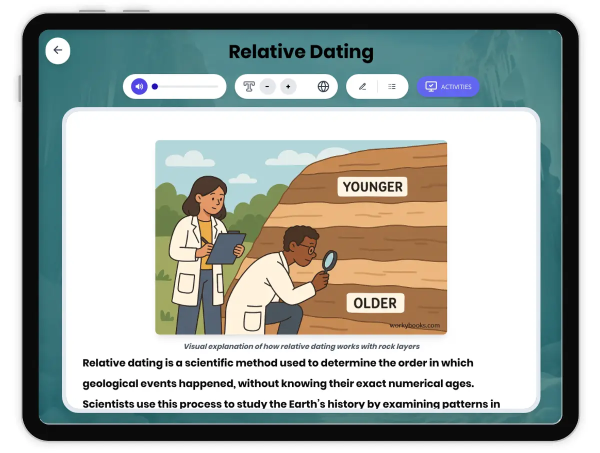 This engaging passage introduces middle school students to the concept of relative dating, a key method used by geologists to determine the sequence of events in Earth's history. Students will learn how the law of superposition, original horizontality, cross-cutting relationships, inclusions, and unconformities help scientists interpret the rock record. The passage also explains the importance of index fossils in correlating rock layers across different locations. By providing real-world examples and showing how multiple concepts interact, the text supports the NGSS standard MS-ESS1-4. Audio integration and interactive activities, such as graphic organizers and quizzes, deepen student understanding. This resource is ideal for grades 6-8 and equips students with foundational geoscience literacy, preparing them for more advanced study.