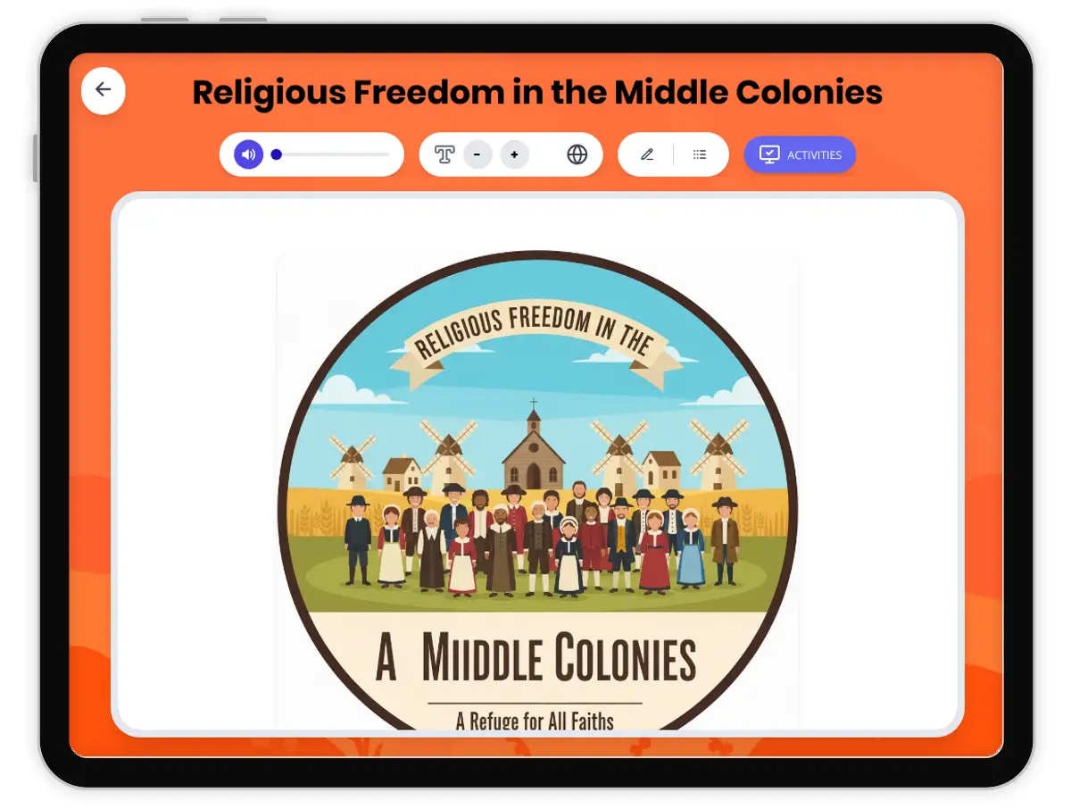 This engaging U.S. History reading passage explores the theme of religious freedom in the Middle Colonies during colonial America. Students will learn how people of different backgrounds, such as Quakers, Dutch, and others, helped create colonies where many religions were accepted and respected. Key events and figures, including William Penn and his founding of Pennsylvania, are explained in a chronological, student-friendly narrative. The passage emphasizes the bravery and unity of colonists who sought a place to worship freely and the lasting impact of their choices. Activities include a multiple-choice quiz, writing prompts, and a graphic organizer to support comprehension. The resource includes a Spanish translation and is aligned with C3 Framework D2.His.4.3-5 and RI.4.3 standards. This passage provides an inspiring look at early American values and supports students’ reading and critical thinking skills. Read aloud audio and a glossary of key vocabulary terms are included to enhance accessibility and understanding.