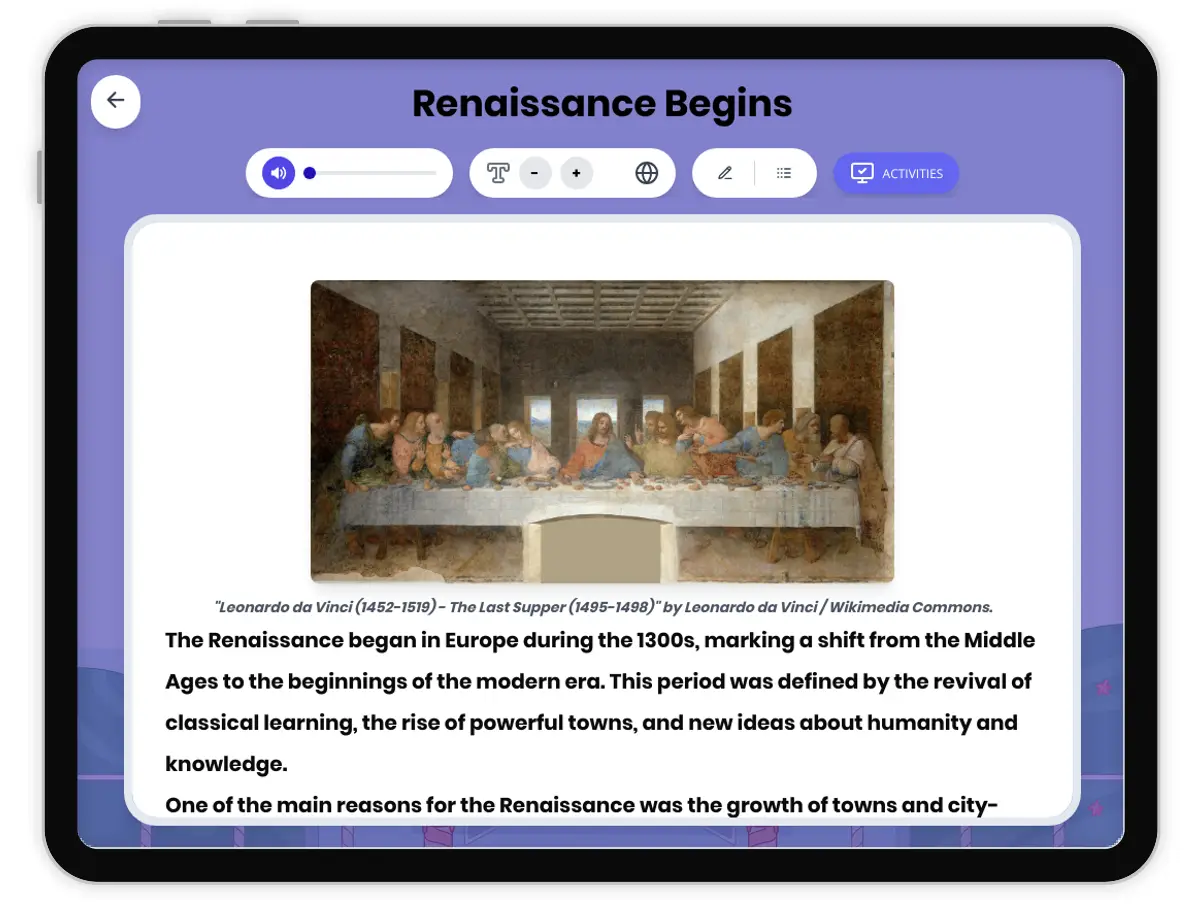 This engaging history reading passage introduces students to the beginning of the Renaissance, a time when Europe shifted from the medieval era to the modern world. The text explores how growing towns, increased trade, and new wealth led to the revival of classical learning and the emergence of humanism. Students will learn about the important role of Italian city-states like Florence, the influence of ancient Greek and Roman texts, and how people’s views on life and learning began to change. The passage includes references to primary sources, key historical terms, and cause-and-effect relationships, making it ideal for building critical reading and analysis skills. With a glossary, differentiated versions, reading comprehension activities, and Spanish translation, this resource meets CA HSS 7.8 and CCSS RI.6-8 standards, and supports diverse learners with accessible content, read-aloud audio, and visual supports.