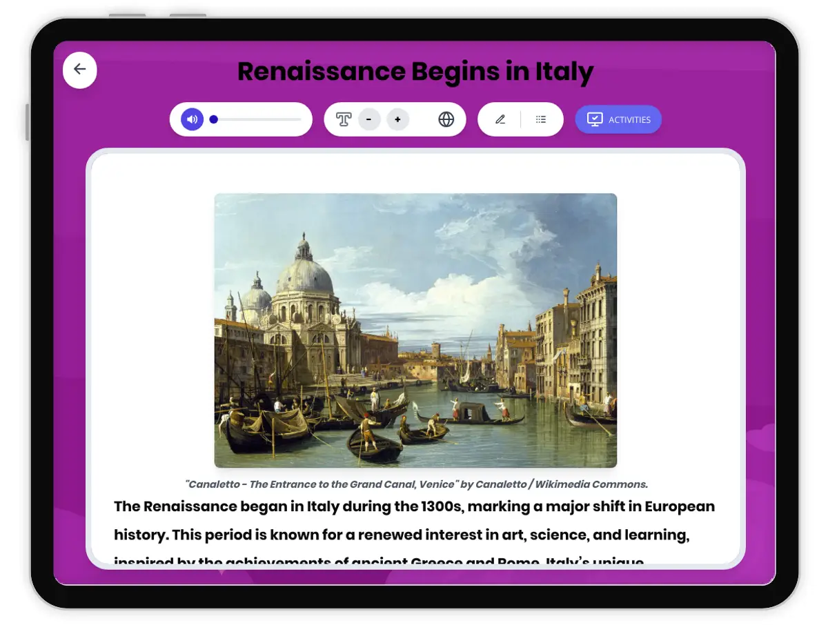 This passage explores the origins of the Renaissance in Italy, focusing on the geographic, economic, and cultural factors that led to this transformative period in world history. Students will learn how Italy's location encouraged trade, how city-states like Florence and Venice grew wealthy, and how the merchant class supported artists and scholars. The passage connects to primary sources and archaeological evidence, discusses social life and hierarchy, and highlights the continuity and change from medieval times. Activities include a glossary, timeline, graphic organizers, comprehension questions, and Spanish translations. This resource aligns with CA HSS 7.8 and CCSS RH.6-8.2, offering a rigorous, standards-based history reading passage with read aloud audio and Spanish translation, making it ideal for diverse learners.