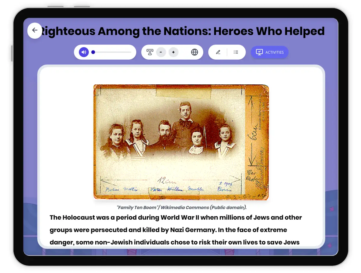 This passage explores the Righteous Among the Nations, a special title given to non-Jews who risked their lives to save Jews during the Holocaust in World War II. Students will examine real-life examples, including Oskar Schindler and Irena Sendler, and learn about the geographic and social contexts of Nazi-occupied Europe. The passage incorporates evidence from primary sources, analyzes cause-and-effect relationships, and highlights the impact of these courageous individuals. Activities include a glossary, multiple-choice quiz, writing prompts, graphic organizers, and a timeline to reinforce understanding. The passage is aligned with California HSS 7.8, CCSS RI.6.1, RI.6.4, and supports historical thinking skills. Spanish translation and read aloud audio are included for accessibility. This resource provides an engaging way for students to analyze history and understand the significance of moral choices during times of crisis.