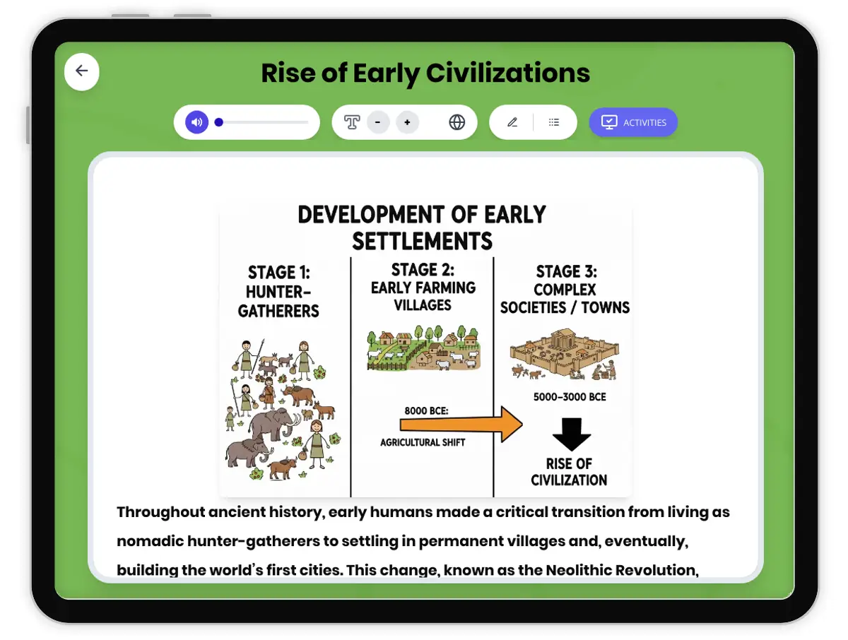 This reading passage explores the critical transformation from early human hunter-gatherer societies to the development of villages and cities, marking the birth of civilization. Students will discover how the Agricultural Revolution allowed people to settle in one place, leading to the rise of complex societies along rivers such as the Tigris, Euphrates, Nile, and Indus. The passage highlights archaeological evidence, such as the site of Çatalhöyük, and discusses the significance of social hierarchy, technological innovation, and adaptation. Activities aligned with CA HSS 6.1 and CCSS RI.6.1 deepen understanding through multiple choice, writing, graphic organizers, and Spanish translation, fostering historical thinking skills. Also includes a read-aloud audio option.