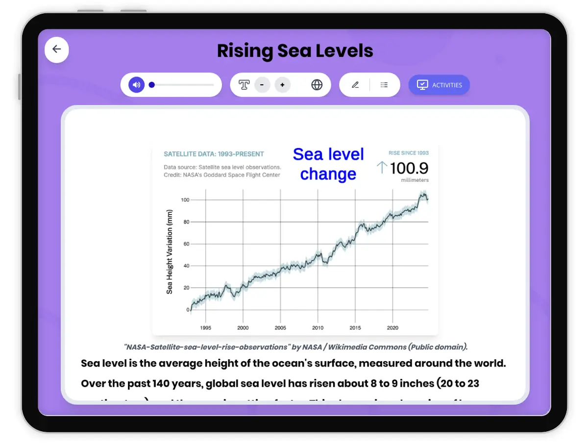 This science passage, written for grades 6-8, explores the phenomenon of rising sea levels, a key topic aligned with NGSS standard MS-ESS3-5. Students will learn about the scientific evidence and mechanisms behind rising sea levels, including thermal expansion and melting land ice, and how these factors interact with Earth's systems. The passage presents real-world examples, such as the impact on cities like Miami and river deltas in Bangladesh, and explains consequences like coastal flooding, storm surge, and saltwater intrusion. It emphasizes scientific thinking by describing how scientists measure and study sea level change, and connects the topic to broader environmental and societal issues. Audio integration supports diverse learners. This resource is suitable for use in physical science, earth science, and environmental science units, and includes interactive activities, a glossary, and graphic organizers to deepen understanding.