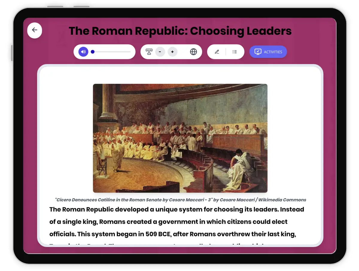 This engaging passage explores the political system of the Roman Republic, focusing on how Roman citizens chose their leaders and the roles of the Senate, consuls, and elected officials. Students will learn about the complex structure of Roman government, the importance of civic participation, and how geography and social hierarchy shaped daily life in ancient Rome. The passage includes primary source evidence, cause-and-effect relationships, and connections to broader themes in world history. Activities include a reading comprehension quiz, writing prompts, graphic organizers, and a chronological timeline. The resource is aligned with CA HSS 6.7 and CCSS RH.6-8.2 standards. This history reading passage features an audio read aloud and a full Spanish translation, making it accessible for diverse learners. Key vocabulary is highlighted throughout, and students are encouraged to analyze history like a historian. Ideal for building literacy and historical thinking skills.