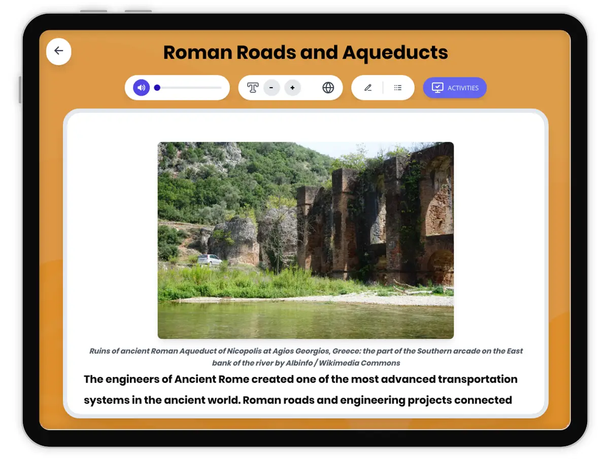This reading passage explores the remarkable engineering and road-building achievements of Ancient Rome, providing students with a detailed look at how Roman infrastructure transformed their society and expanded the empire. Students will learn about the construction of Roman roads, the technology behind aqueducts, and the impact of such advancements on military and daily life. The passage is supported by key vocabulary, a Spanish translation, a glossary, and multiple activities including a quiz, writing prompts, and graphic organizers. This resource aligns with CA HSS 6.7 and CCSS RI.6-8.1, offering a rigorous, standards-based approach to learning about the Roman Empire. An audio read aloud and Spanish translation support diverse learners. Ideal for social studies classrooms focused on ancient civilizations and technological innovation.