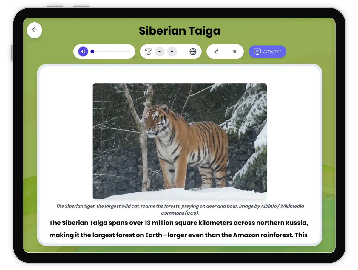 This engaging middle school science passage explores the Siberian Taiga, the world’s largest forest ecosystem, stretching across northern Russia. Students will learn about the taiga’s extreme continental climate, the role of permafrost, and its diverse wildlife, including the Siberian tiger and reindeer. The passage explains complex interactions between climate, soil, plants, and animals, as well as the importance of the taiga in carbon storage and global climate regulation. It also discusses the risks posed by climate change, such as increased wildfires and thawing permafrost, and how these changes could affect ecosystems worldwide. Designed to meet NGSS MS-LS2-1 and MS-ESS3-5 standards, the resource includes vocabulary support, differentiated reading levels, Spanish translations, and a variety of comprehension and writing activities. Integrated audio options are available, making this an accessible and comprehensive resource for science classrooms.