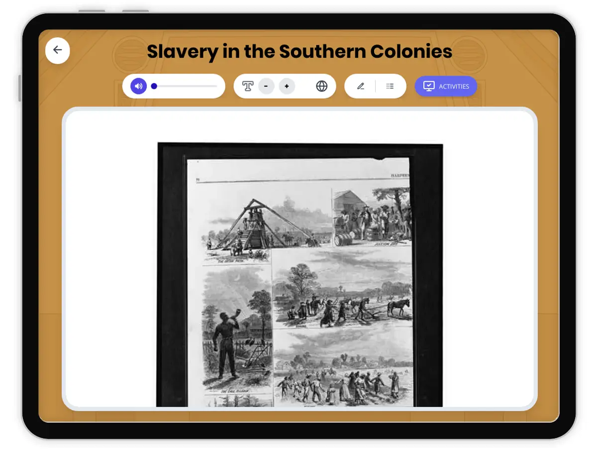 This educational reading passage introduces the topic of slavery in the Southern Colonies during colonial America. Students will learn how enslaved Africans were brought to the colonies, their daily lives, and how slavery became central to the Southern economy. The passage uses clear language and a chronological structure, making it ideal for young readers to build foundational literacy and historical understanding. Key vocabulary words are highlighted and defined in a glossary. The passage ends with an inspiring fact and is supported by a timeline, multiple-choice questions, writing prompts, and a graphic organizer activity. This resource aligns with D2.His.1.3-5, D2.His.2.3-5, RI.4.3, RI.4.4, and W.4.2 standards. It includes a read aloud audio and a full Spanish translation for accessibility. Perfect for classroom or home learning, this passage helps students connect past events to present-day issues and builds critical thinking about America's history.