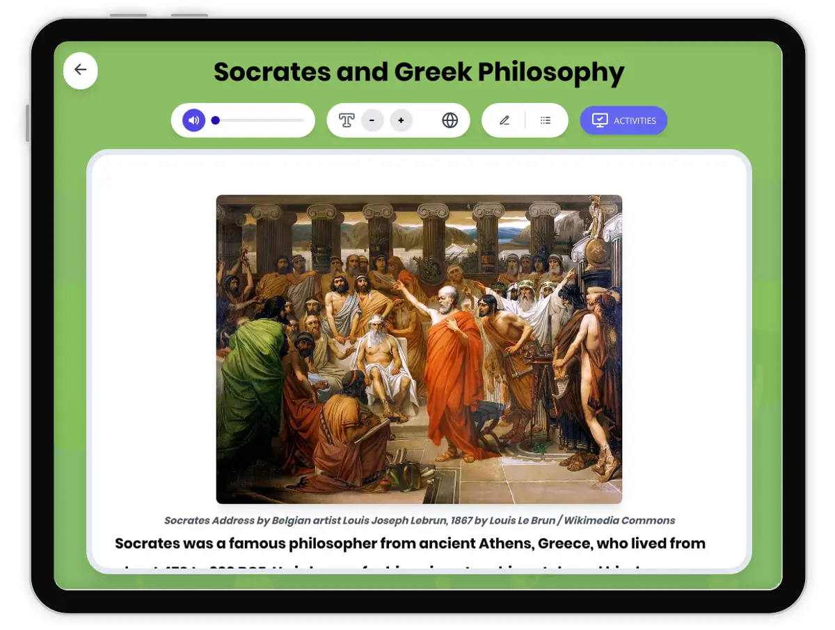 This engaging history reading passage explores the life and legacy of Socrates, the ancient Greek philosopher renowned for his method of questioning and his influence on Western philosophy. Students will learn about Socrates’ background in Athens, his unique approach to teaching, and his impact on critical thinking and democratic society. The passage includes references to primary sources like Plato’s dialogues and archaeological discoveries, and discusses the social context of ancient Greece. Activities include a glossary, multiple-choice quiz, writing tasks, graphic organizers, and a timeline, all aligned with CA HSS 6.4.1 and CCSS RH.6-8.1 standards. Students can access a Spanish translation and read aloud audio, ensuring accessibility. This resource supports inquiry-based learning and historical analysis, making connections to broader themes in world history and the development of human thought.