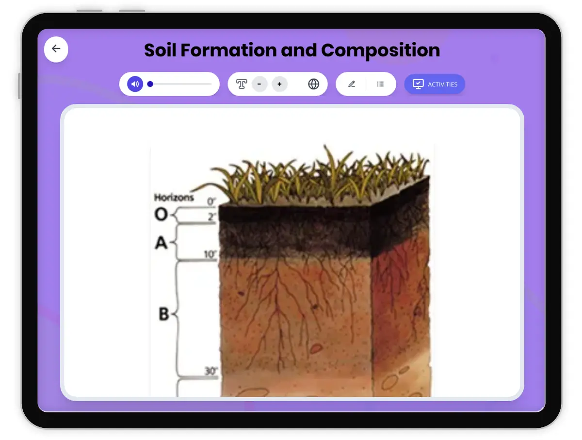 This comprehensive middle school science passage explores soil formation and composition, perfectly aligned to NGSS standard MS-ESS2-1. Students will learn how soil forms through the weathering of bedrock and the accumulation of organic matter over time. The passage explains the main factors influencing soil formation, such as climate, organisms, parent material, topography, and time, and details the quantitative composition of soil: minerals (45%), water (25%), air (25%), and organic matter (5%). Students will also discover the different soil horizons (O, A, B, C, and R), their characteristics, and how soil types vary across climates and ecosystems. The text emphasizes soil's role as a living ecosystem, housing billions of organisms, and highlights its essential functions—supporting plant life, filtering water, storing carbon, and providing habitat. With integrated audio, a Spanish translation, a differentiated reading version, glossary, comprehension activities, and graphic organizers, this resource offers a complete, standards-based learning experience for grades 6–8.