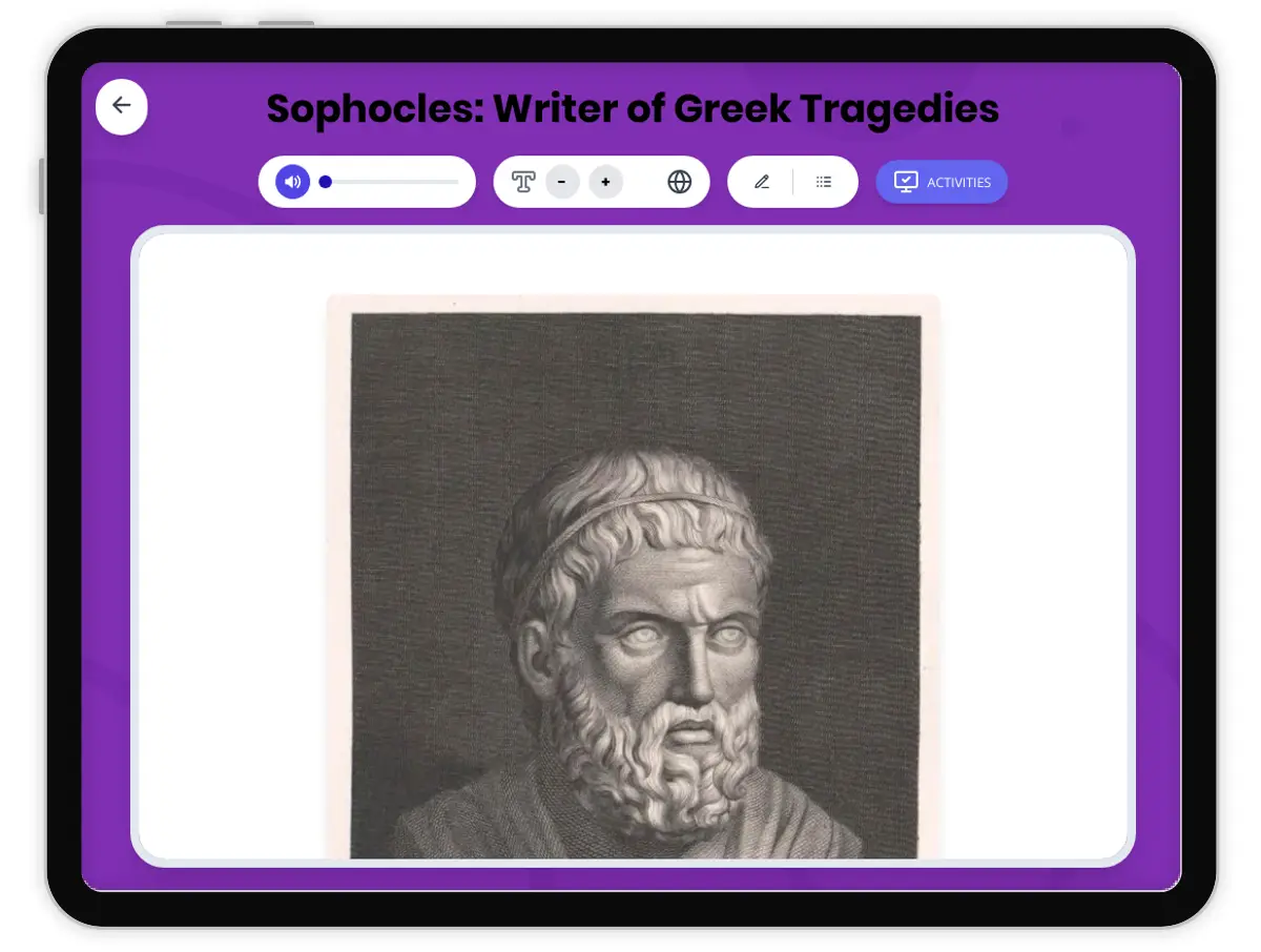 This passage explores the life and legacy of Sophocles, one of the most influential playwrights of ancient Greece, whose works like Oedipus Rex shaped the history of theater and literature. Students will learn about the context of Athenian society, the role of drama festivals, and the significance of tragedy in civic life. The passage provides insight into historical evidence, cause-and-effect relationships, and the changes in Greek drama over time. It is accompanied by a glossary, timeline, comprehension quiz, writing activities, and two graphic organizers to deepen historical understanding. Spanish translation and read aloud audio are included. This resource aligns with CA HSS 6.4 and CCSS RI.6-8 standards, making it ideal for history and literacy skill development.