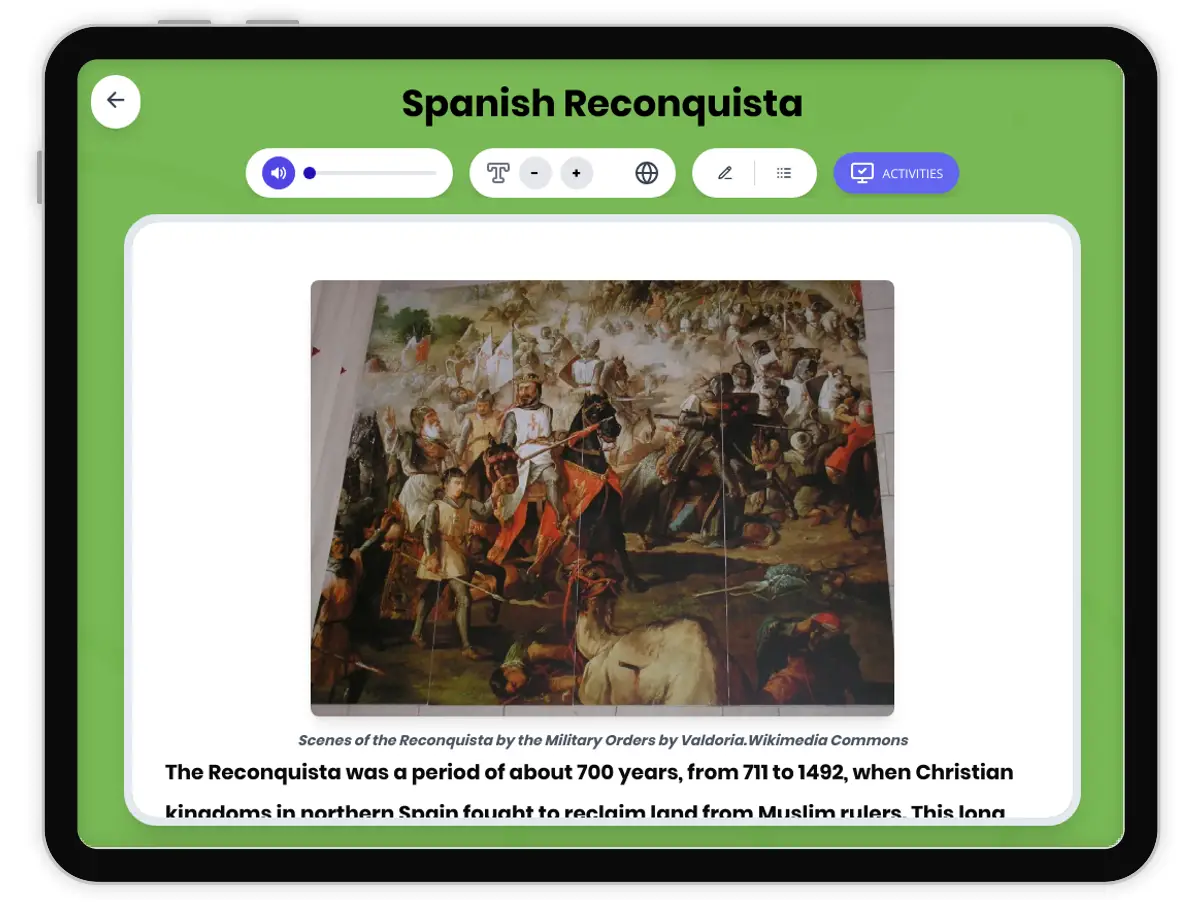 This engaging world history reading passage examines the Reconquista, the 700-year period during the Middle Ages when Christian kingdoms in Spain fought to reclaim the Iberian Peninsula from Muslim rule, culminating in 1492. Students will learn about key battles, important rulers like Ferdinand and Isabella, and how geography and culture shaped this era. The passage includes primary source evidence, highlights change over time, and connects to wider world history themes. Activities include a multiple-choice quiz, writing prompts, graphic organizers, and a timeline, making it ideal for classroom or independent study. The resource is aligned with CA HSS 7.2.3 and CCSS RH.6-8.2, and features a Spanish translation and read aloud audio to support diverse learners.