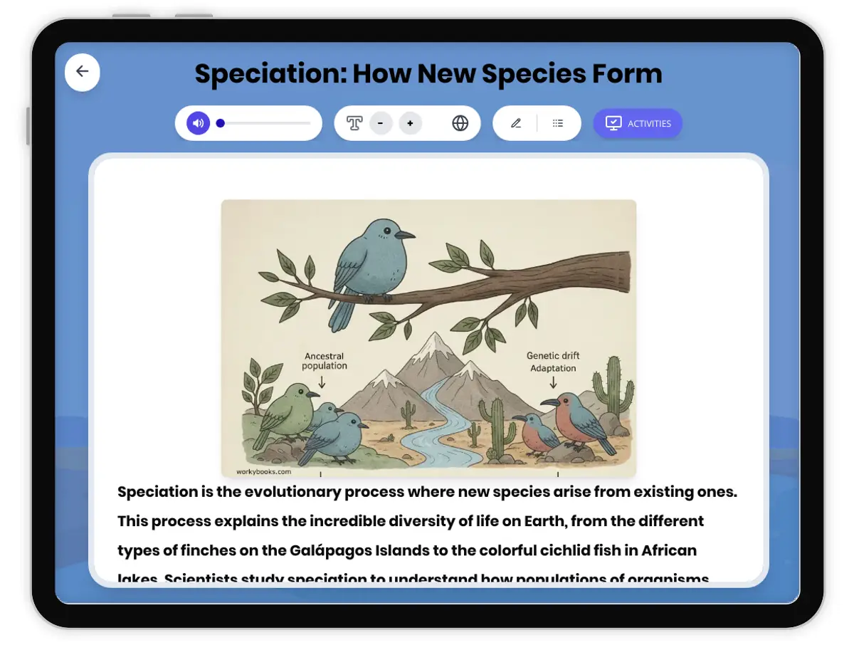 This comprehensive science passage introduces middle school students to the concept of speciation, the process by which new species arise from existing populations. The reading explains the mechanisms behind speciation, such as reproductive isolation, allopatric and sympatric speciation, and explores real-world examples like Galápagos finches, cichlid fish in African lakes, and Hawaiian honeycreepers. Students will learn about different types of reproductive barriers—geographic, behavioral, and temporal—and how these lead to genetic divergence and the formation of new species. The passage is carefully aligned with NGSS MS-LS4-4 and integrates academic vocabulary with accessible explanations. Activities include quizzes, writing prompts, and graphic organizers to reinforce understanding. Audio integration is available for all content, supporting diverse learning needs. This resource is ideal for classroom instruction, homework, or independent study and helps students connect speciation to broader scientific principles and real-world biodiversity.