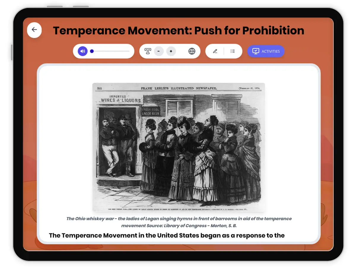 This passage explores the Temperance Movement and the push for Prohibition in the United States. Students will learn about the causes, motivations, and consequences of the campaign to ban alcohol, examining both the supporters and opponents of temperance. The reading uses a compare/contrast structure and incorporates a primary source quote for analysis, meeting C3 Framework and Common Core standards. Activities include a timeline, glossary, multiple-choice quiz, writing prompts, and a T-Chart graphic organizer, designed to build historical reasoning and vocabulary. The passage is accompanied by a glossary of key terms, a Spanish translation, and a relevant historical image. Audio narration is provided for accessibility. This resource is ideal for developing reading comprehension and critical thinking skills in U.S. history.