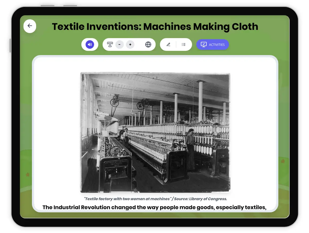 This history reading passage examines how the spinning jenny, water frame, and power loom revolutionized textile production during the Industrial Revolution. Students will learn about the causes and effects of these inventions, the people involved, and their impact on society and daily life. The passage uses vocabulary like mechanization, innovation, and efficiency in context to support academic language acquisition. Activities include a glossary, multiple-choice quiz, writing prompts, graphic organizers, and a timeline. The passage is aligned with California History-Social Science Standard 6.4 and CCSS RI.6-8, and is available with read aloud audio and a full Spanish translation. The text encourages students to analyze historical change, connect technological advances to social developments, and explore the consequences of industrialization in world history.