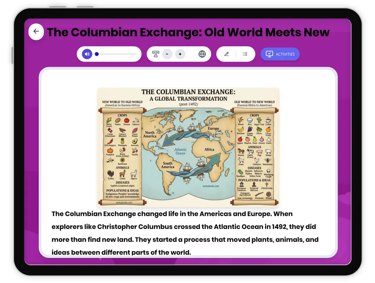 This engaging U.S. history reading passage explores the Columbian Exchange and its impact on Colonial America. Students will learn how the arrival of European explorers led to the transfer of plants, animals, and ideas between the Old World and the New World. The passage highlights important events, cause-and-effect relationships, and how these changes shaped both Native American and European lives. Key vocabulary is explained to build literacy skills. The resource includes a glossary, a multiple-choice quiz, a writing activity, and a timeline of major events. A Spanish translation and read aloud audio are available for accessibility. Activities and graphic organizers help students analyze, compare, and connect historical events, making the content interactive and meaningful. This passage and activities align with D2.His.2.3-5, D2.His.3.3-5, RI.4.3, RI.4.4, W.4.2. Perfect for building understanding of the Columbian Exchange and Colonial America.