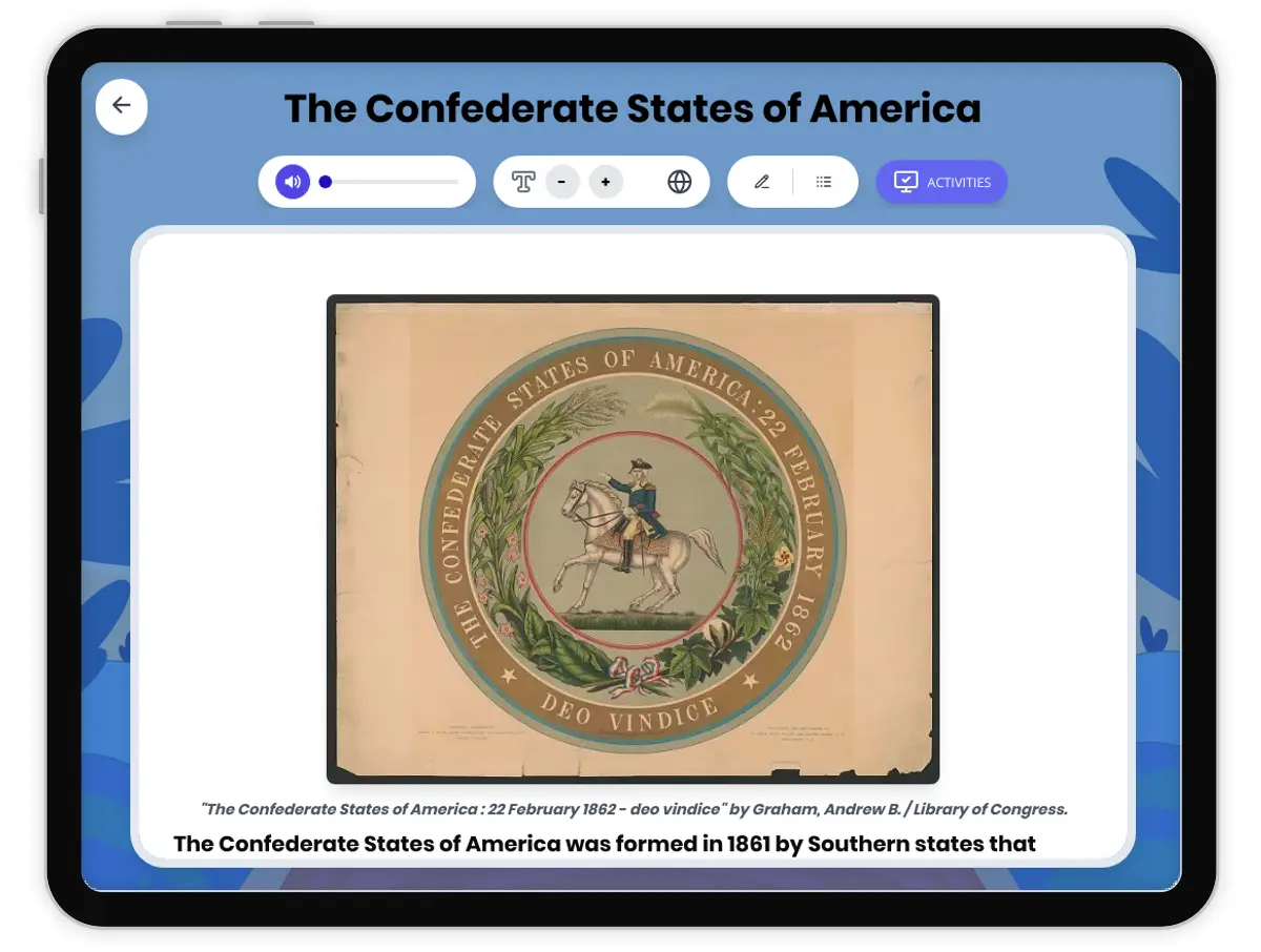 This comprehensive history reading passage examines the formation and significance of the Confederate States of America. It explores the causes, motivations, and consequences of Southern secession, the establishment of a rival government, and the start of the Civil War. Multiple perspectives are included, with clear analysis of the complex conflicts between states’ rights and union unity. The passage features a primary source quote, glossary, timeline, and activities designed to deepen critical thinking. Students can access read aloud audio, Spanish translations, and differentiated versions for accessibility. The resource is aligned with CA HSS 8.10 and TEKS 8.8 history standards, as well as Common Core RI.6-8 and W.6-8 ELA standards, ensuring rigorous content for developing historical understanding. Ideal for building vocabulary and analytical skills, this lesson enhances knowledge about a pivotal era in U.S. history.