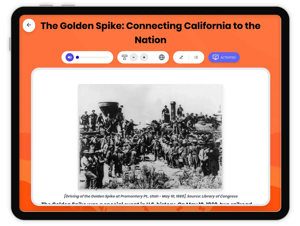This engaging U.S. history reading passage teaches students about the Golden Spike and how the first transcontinental railroad connected California to the rest of the nation. Students will learn about the Central Pacific and Union Pacific Railroads, the workers who built them, and the impact this achievement had on American growth and unity in the late 1800s. The passage is structured with clear, simple language for developing readers and includes a glossary, timeline, Spanish translation, and historical activities. Aligned with C3 Framework and Common Core standards, this resource encourages students to explore cause and effect, analyze historical events, and build vocabulary. Includes a relevant public domain image, read aloud audio, and multiple activities for a comprehensive learning experience.
