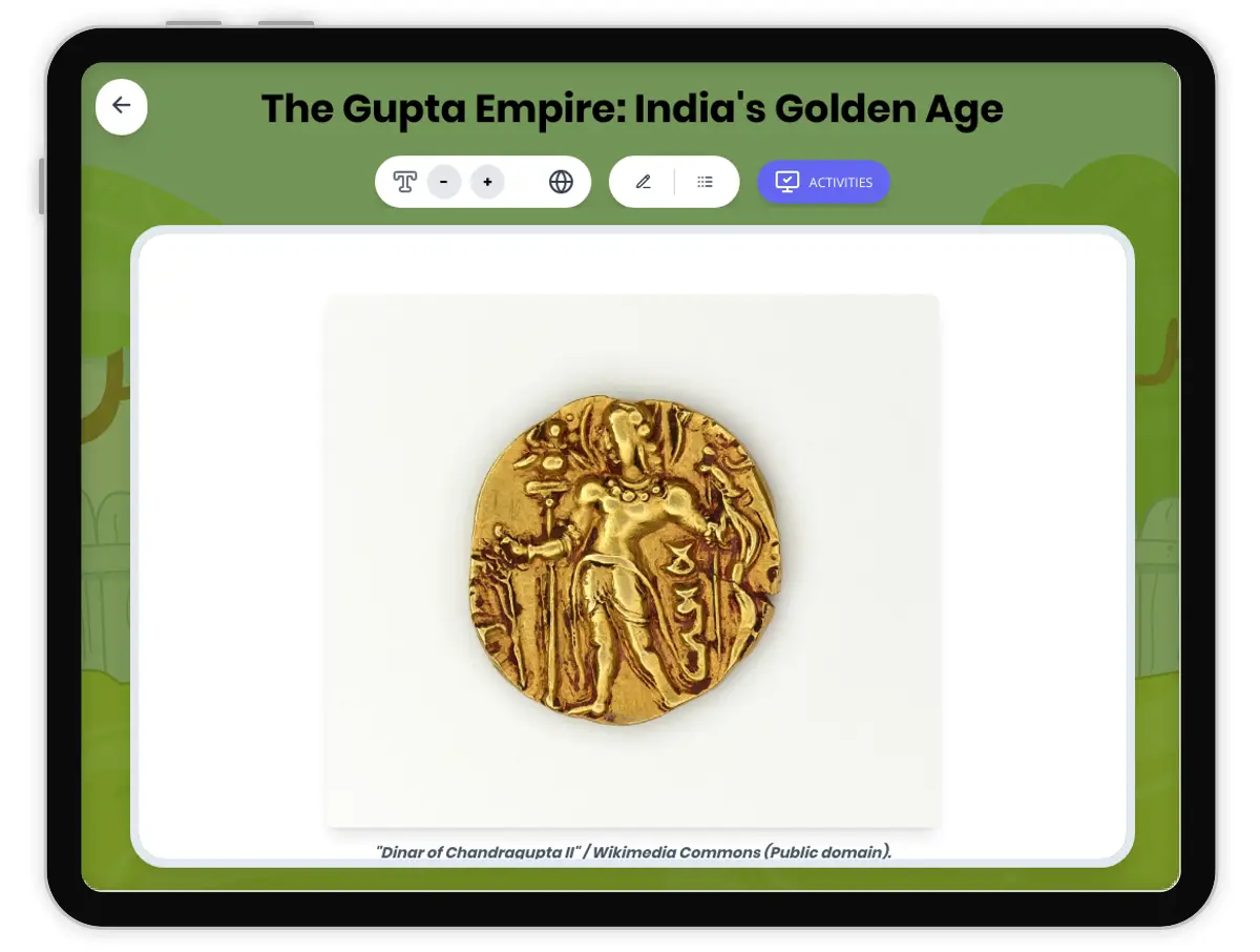 This engaging history reading passage explores the Gupta Empire, known as India's Golden Age, and is aligned to HSS 6.5 and CCSS RH.6-8.1, RH.6-8.2. Students will learn about the rise of the Gupta dynasty, scientific and artistic achievements, and daily life in ancient India. Rich with specific examples and cause-and-effect relationships, the passage connects the empire’s growth to its geographic context and human impact. Activities include a glossary, timeline, graphic organizers, and assessment questions, supporting analysis and comprehension. Read aloud audio and a complete Spanish translation make this resource accessible for all learners. Designed for students to investigate history like historians, the content builds skills in evidence analysis, chronology, and critical thinking.