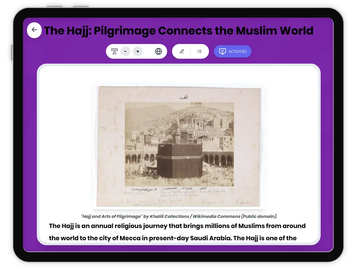 This comprehensive history reading passage explores the origins, development, and significance of the Hajj pilgrimage in the ancient Middle East. Students will learn how the Hajj shaped social, religious, and economic life in the Islamic world, as well as its role in connecting diverse peoples across Africa, Asia, and Europe. The passage is aligned to CA HSS 6.2 and CCSS RH.6-8.1, ensuring rigorous content and skill development. Included are a Spanish translation, differentiated simplified version, glossary, quiz, writing prompts, graphic organizers, and a timeline of key historical developments. Read aloud audio and vocabulary support make this resource accessible and engaging for all learners.