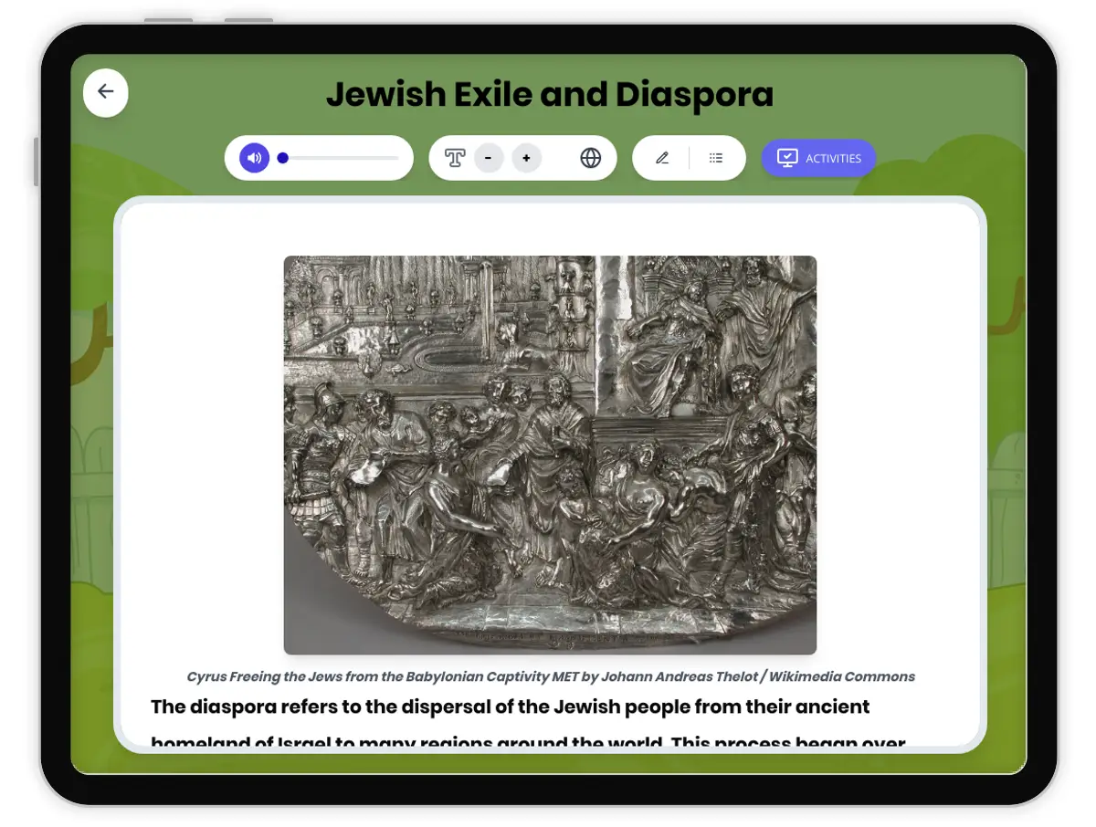 This engaging passage explores the exile and diaspora of the Jewish people from ancient Israel, focusing on key events such as the Babylonian Captivity and Roman dispersal. Students will examine how geography, conquest, and social structures shaped Jewish history and identity. Using evidence from archaeological finds and primary sources, the passage traces cause-and-effect relationships and change over time, while highlighting the significance of the diaspora on both Jewish and world history. Accompanying activities include a multiple-choice quiz, writing prompts, graphic organizers, glossary, and a Spanish translation. The passage and resources are aligned with California History-Social Science Standard 6.3.3 and Common Core ELA standards CCSS RH.6-8.1, RH.6-8.2, and WHST.6-8.2. A read aloud audio and a public domain historical image further support comprehension and engagement.