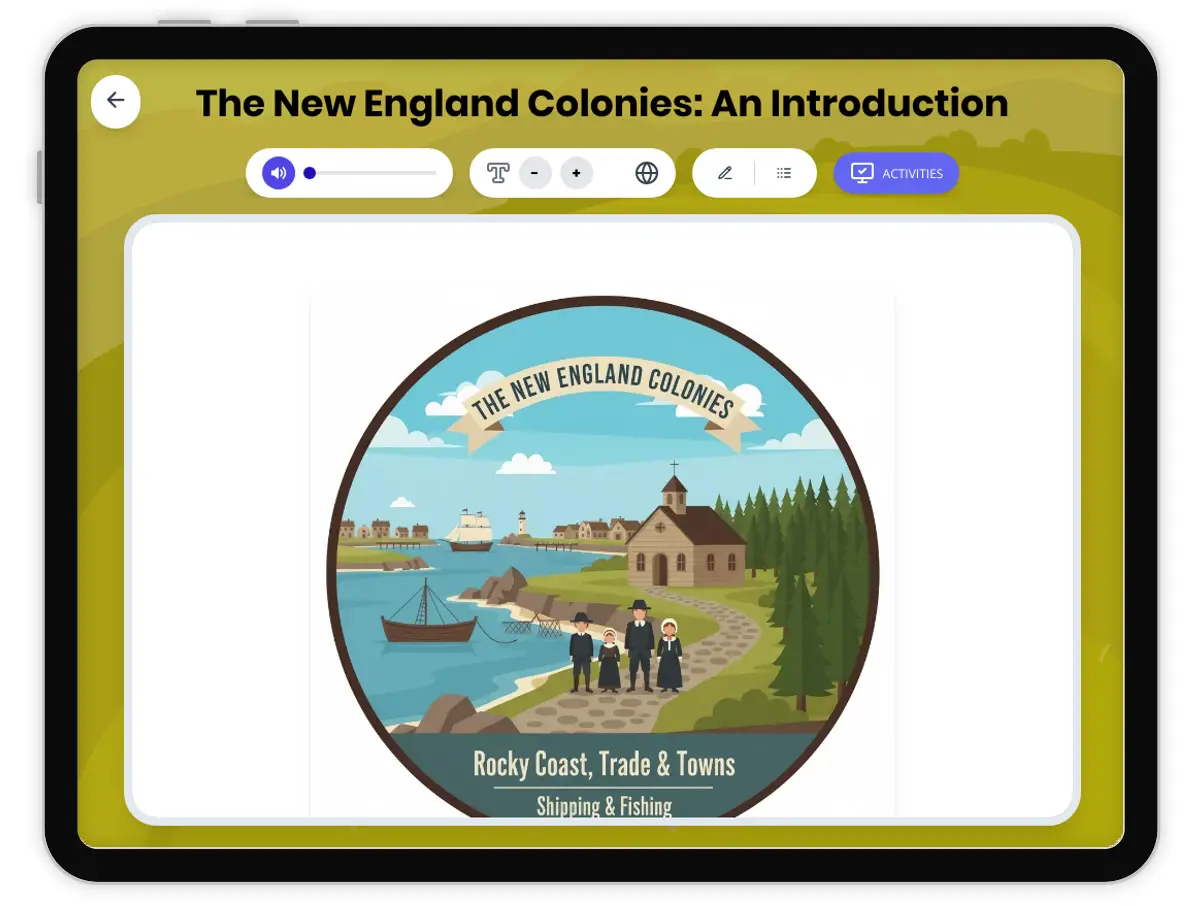 This engaging U.S. history reading passage introduces students to the New England Colonies, offering a clear overview of their founding, key people, and life in the colonies. Highlighting the bravery and unity of early settlers like the Pilgrims and Puritans, it covers essential events such as the founding of Plymouth, the first Thanksgiving, and the development of colonial towns. The passage uses simple language, active voice, and concrete examples to help students understand the cause-and-effect relationships in history. Aligned with C3 and Common Core standards, the resource includes a glossary, timeline, Spanish translation, and comprehension activities such as a quiz, writing prompts, and graphic organizers. A public domain image brings the story to life, and a coloring page prompt is provided for creative engagement. This passage is perfect for building foundational literacy and historical knowledge, and includes read aloud audio and Spanish translation for accessibility.