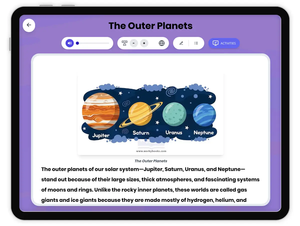 This engaging science passage for grades 6-8 introduces students to the outer planets—Jupiter, Saturn, Uranus, and Neptune—emphasizing their role as gas and ice giants in our solar system. Students will learn about the planets’ massive sizes, unique atmospheres, ring systems, and diverse moons such as Europa, Titan, and Enceladus. The text explores how these characteristics result from their distance from the Sun and different chemical makeups. It covers historical and recent space missions like Voyager, Juno, and Cassini, demonstrating how scientists gather evidence about these distant worlds. The passage is aligned with NGSS standards MS-ESS1-2 and MS-ESS1-3, focusing on planetary systems and scientific investigation. Activities include comprehension questions, writing prompts, graphic organizers, and vocabulary support. The passage is audio-integrated and available in both English and Spanish, making it accessible for diverse learners.