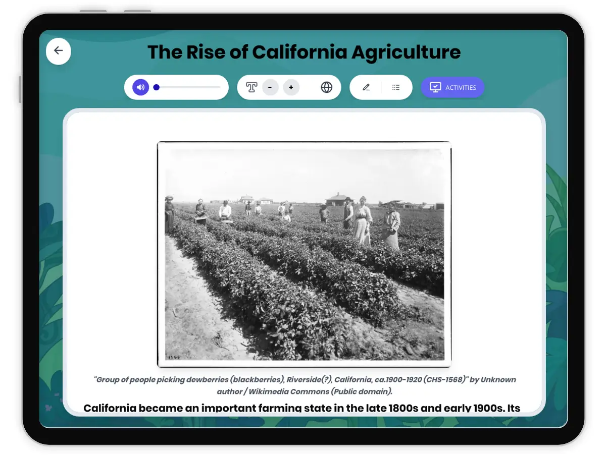 This engaging reading passage explores the rise of California agriculture during the Progressive Era, focusing on how farming changed the state and the nation. Students will learn about the challenges faced by early farmers, the development of irrigation systems, and the impact of new technology and migrant workers. The passage is written clearly for young readers and supports key history and literacy skills, aligning with C3 Framework and Common Core Standards. Activities include a timeline, quiz, writing prompts, and a graphic organizer. Also included are read aloud audio and a full Spanish translation to support diverse learners. Key vocabulary is highlighted for comprehension. This is an ideal resource for teaching about the growth of agriculture and its role in U.S. history.
