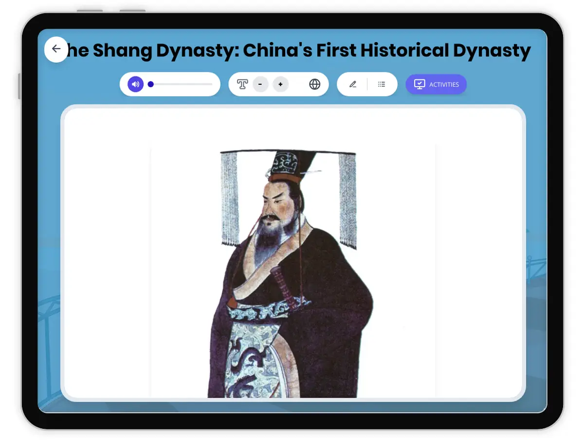 This comprehensive history reading passage explores the Shang Dynasty, recognized as China's first historical dynasty. Students will learn about the origins, society, technological advances, and cultural achievements of the Shang Dynasty, supported by archaeological discoveries like oracle bones and bronze artifacts. The passage addresses change and continuity, cause-and-effect relationships, geographic context, and the significance of the Shang Dynasty in world history. Activities include a multiple-choice quiz, writing prompts, graphic organizers, and a chronological timeline. Glossary terms support academic vocabulary development. This resource aligns with CA HSS 6.6 and CCSS ELA-Literacy.RI.6.1, W.6.2, and SL.6.1. It features a Spanish translation and read aloud audio to support diverse learners, making it ideal for classrooms studying Ancient China and the development of early civilizations.