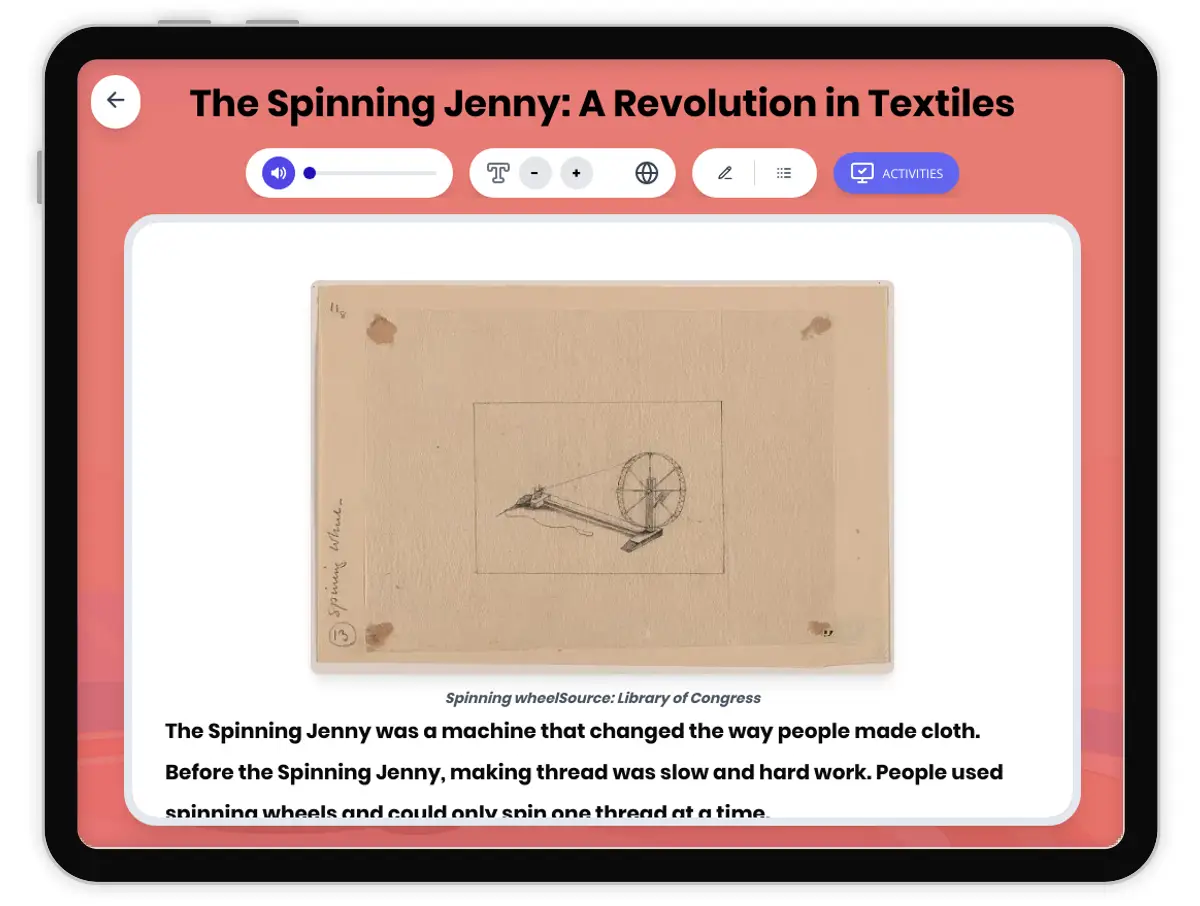 This U.S. history reading passage explores the invention of the Spinning Jenny and its important role in the Industrial Revolution. Students will learn how this invention changed the textile industry and helped shape modern industry in America. The passage follows a chronological narrative highlighting key events, figures like James Hargreaves, and the cause-and-effect relationships between invention and social change. Designed for young readers, the passage uses simple language, short sentences, and clear structure to aid understanding. Features include a glossary of key terms, a multiple-choice quiz, timeline, and writing activities to deepen historical thinking. Aligned with C3 Framework (D2.His.2.3-5, D2.His.3.3-5) and ELA standards (RI.4.3, RI.4.4, W.4.2). Includes a read aloud audio and full Spanish translation for bilingual support.