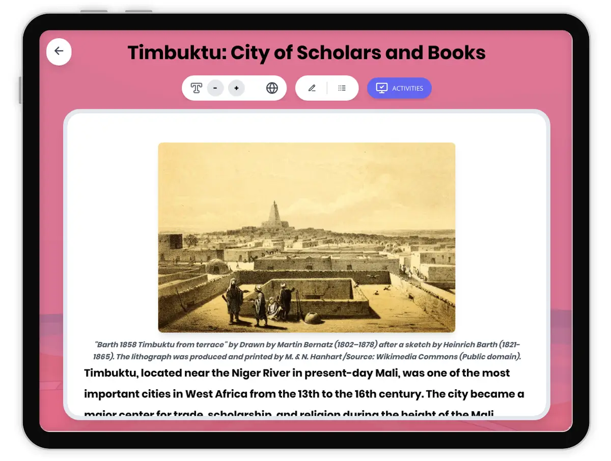 This passage explores the historical significance of Timbuktu, a legendary center of learning and trade in ancient West Africa. Students will learn how Timbuktu became a hub for scholars, the impact of trade on cultural exchange, and the city's famed manuscripts. The passage includes primary source details, examines cause-and-effect relationships, and highlights the connection between geography and human achievement. Activities include a quiz, writing prompts, graphic organizers, and a timeline to deepen understanding. A Spanish translation and read-aloud audio are available. This history reading passage is aligned with CA HSS 6.7, 6.7.7, and CCSS RH.6-8.1, RH.6-8.2, making it ideal for classroom use and independent study on ancient civilizations.