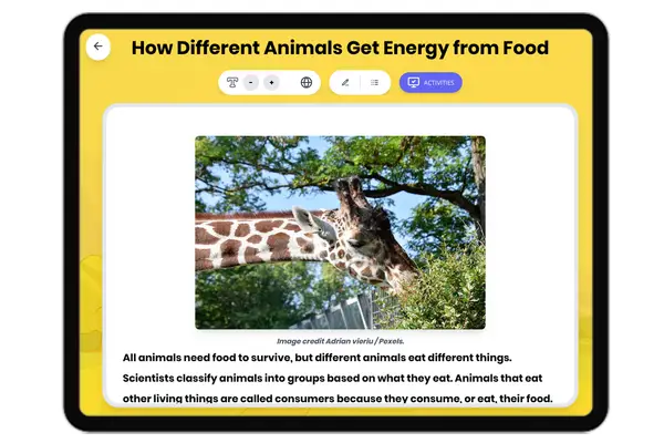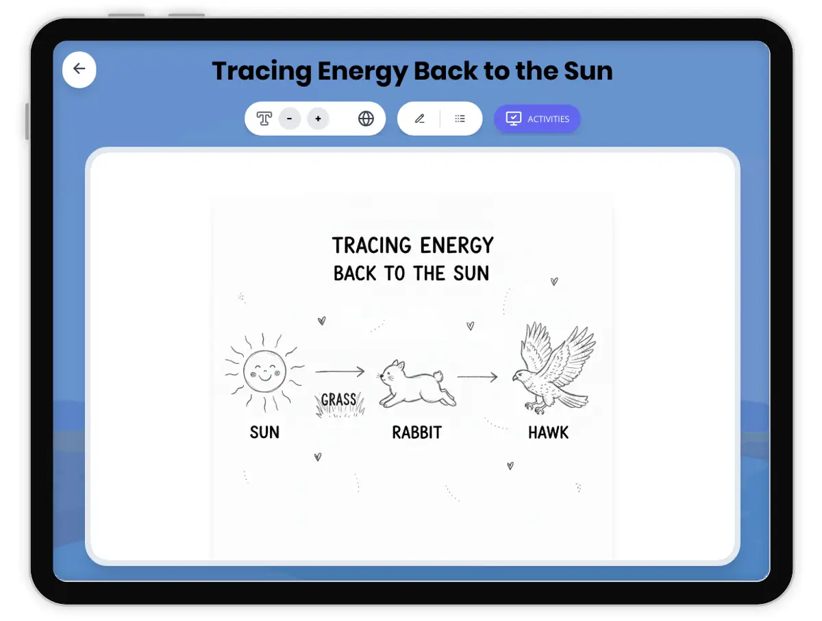 This engaging 400-word reading passage helps fifth-grade students understand how energy flows from the sun through living things. Aligned with NGSS standards 5-LS1-1 and 5-PS3-1, students learn to trace food energy step by step: sunlight hits plants, plants make food through photosynthesis, herbivores eat plants, carnivores eat herbivores, and all energy originates from the sun. The passage uses simple language and real-world examples like grass, rabbits, and hawks to illustrate energy transfer. Students explore how plants capture light energy and convert it into food energy stored in sugars. The passage emphasizes that every food chain begins with the sun as the original energy source. Audio-integrated features support diverse learners, while differentiated versions ensure accessibility for all reading levels. Vocabulary terms like photosynthesis, energy transfer, and food chain are clearly defined. The passage includes comprehension questions, writing activities, and graphic organizers that help students build models of energy flow in ecosystems, meeting core NGSS disciplinary ideas for Grade 5 life science and physical science standards.