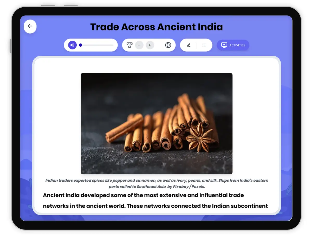 This history reading passage explores Ancient India's trade networks and their impact on global connections. Students will learn how Indian merchants and traders exchanged goods, ideas, and technologies with regions such as Mesopotamia, Rome, China, and Southeast Asia. The text covers archaeological evidence from the Indus Valley, the role of the Silk Road, and the significance of maritime routes in shaping ancient economies and cultures. The passage includes a glossary, multiple-choice quiz, writing activities, graphic organizers, and a timeline. Also provided are a simplified version for struggling readers, a Spanish translation, and a read aloud audio option. This resource aligns with CA HSS 6.5 and CCSS RH.6-8.1, supporting students in analyzing historical causation, using evidence, and understanding global interdependence in the ancient world.