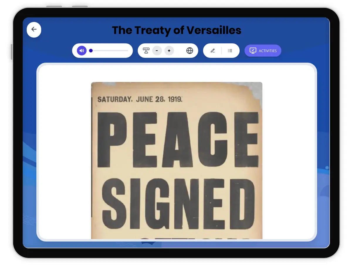This comprehensive history reading passage explores the Treaty of Versailles, the landmark agreement that ended World War I in 1919. Students will analyze the treaty's causes, terms, and far-reaching consequences using accessible yet rigorous academic vocabulary aligned with the CA HSS Framework and CCSS. The passage highlights major figures, primary source excerpts, and the complex political and geographic factors that shaped the peace settlement. Activities include a detailed glossary, multiple-choice quiz, explanatory writing prompts, and graphic organizers to support analytical reading skills. The lesson also features an English and Spanish version of the passage, as well as simplified text for differentiated instruction. Read aloud audio and a timeline of events help students build historical understanding. This resource is ideal for developing mastery of world history content and critical thinking skills related to cause and effect, change over time, and the impact of war and peace agreements.