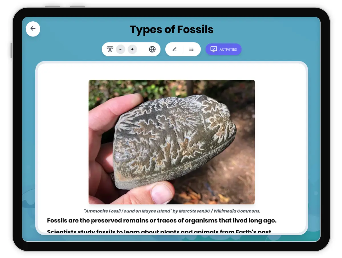 This engaging 250-word reading passage introduces fourth-grade students to the four main types of fossils and how each forms. Aligned with NGSS 4-ESS1-1 and ESS1.C: The History of Planet Earth, the passage explains body fossils (preserved remains like bones and teeth), mold fossils (impressions left in rock), cast fossils (mineral-filled molds), and trace fossils (evidence of organism activity like footprints). Written at a Grade 4 reading level, the passage uses clear definitions and relatable examples to help students understand how different preservation methods create different types of fossils. The audio-integrated lesson includes a simplified differentiated version for struggling readers, Spanish translations, a comprehensive glossary of key terms, multiple-choice questions testing recall and comprehension, writing activities requiring explanation and application, and graphic organizers for comparing fossil types. Students learn that each fossil type provides scientists with unique information about ancient organisms and their behaviors. This foundational knowledge prepares students for hands-on fossil investigations and supports understanding of Earth's history through the fossil record.