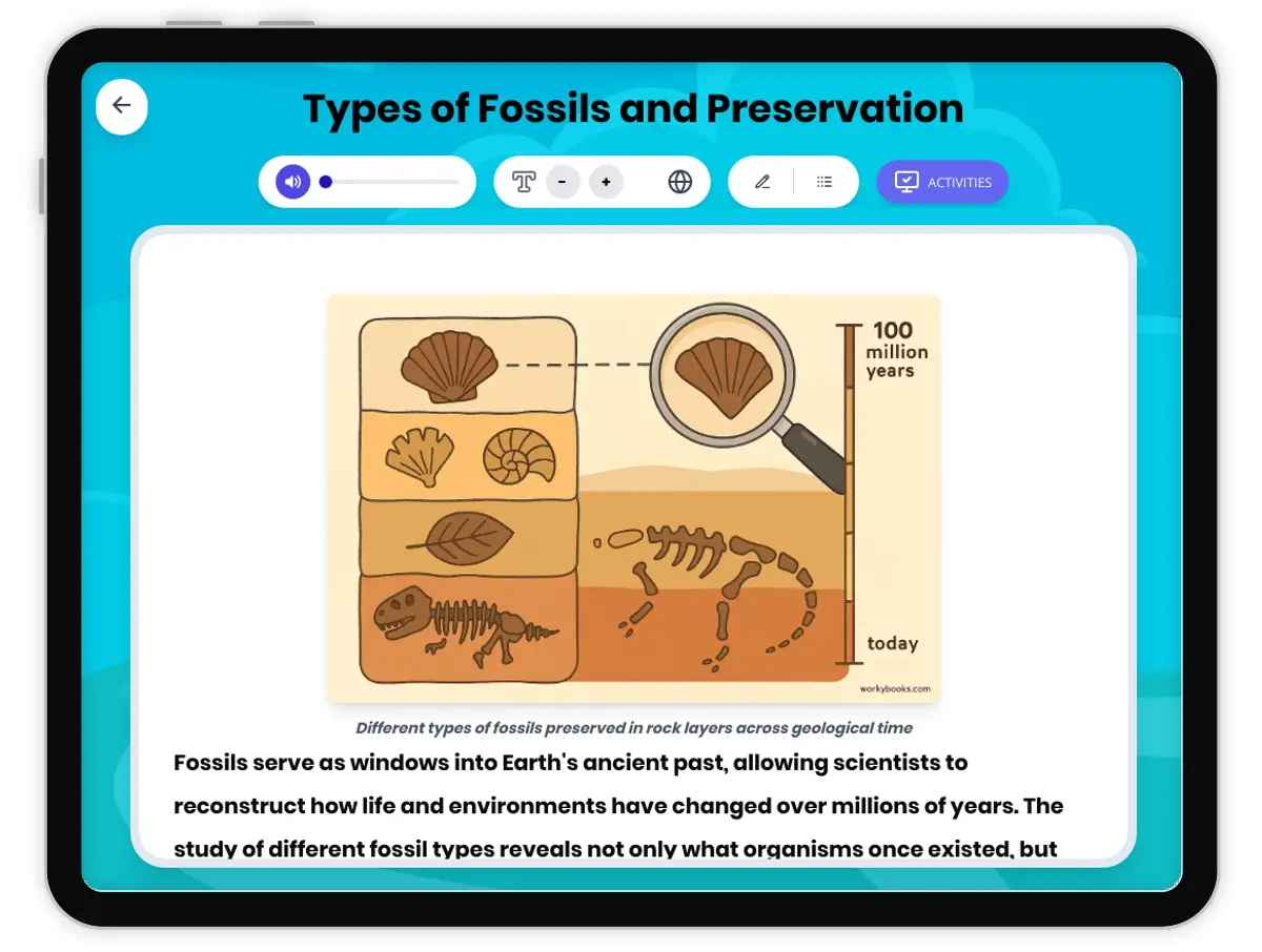 This engaging informational passage for grades 6-8 explores the different types of fossils and the natural processes that preserve them. Students will learn about permineralization, replacement, carbonization, original preservation, molds and casts, and trace fossils. The passage explains how each fossil type forms, what scientific information they provide, and highlights famous fossil sites like the Burgess Shale and La Brea Tar Pits. Activities include a multiple-choice quiz, writing prompts, and graphic organizers to support comprehension and critical thinking. The lesson is fully aligned with NGSS standards MS-ESS1-4 and MS-LS4-1, ensuring that students build key skills in scientific reasoning and understanding Earth's history. Integrated audio support and Spanish translations make this resource accessible and inclusive for diverse learners.