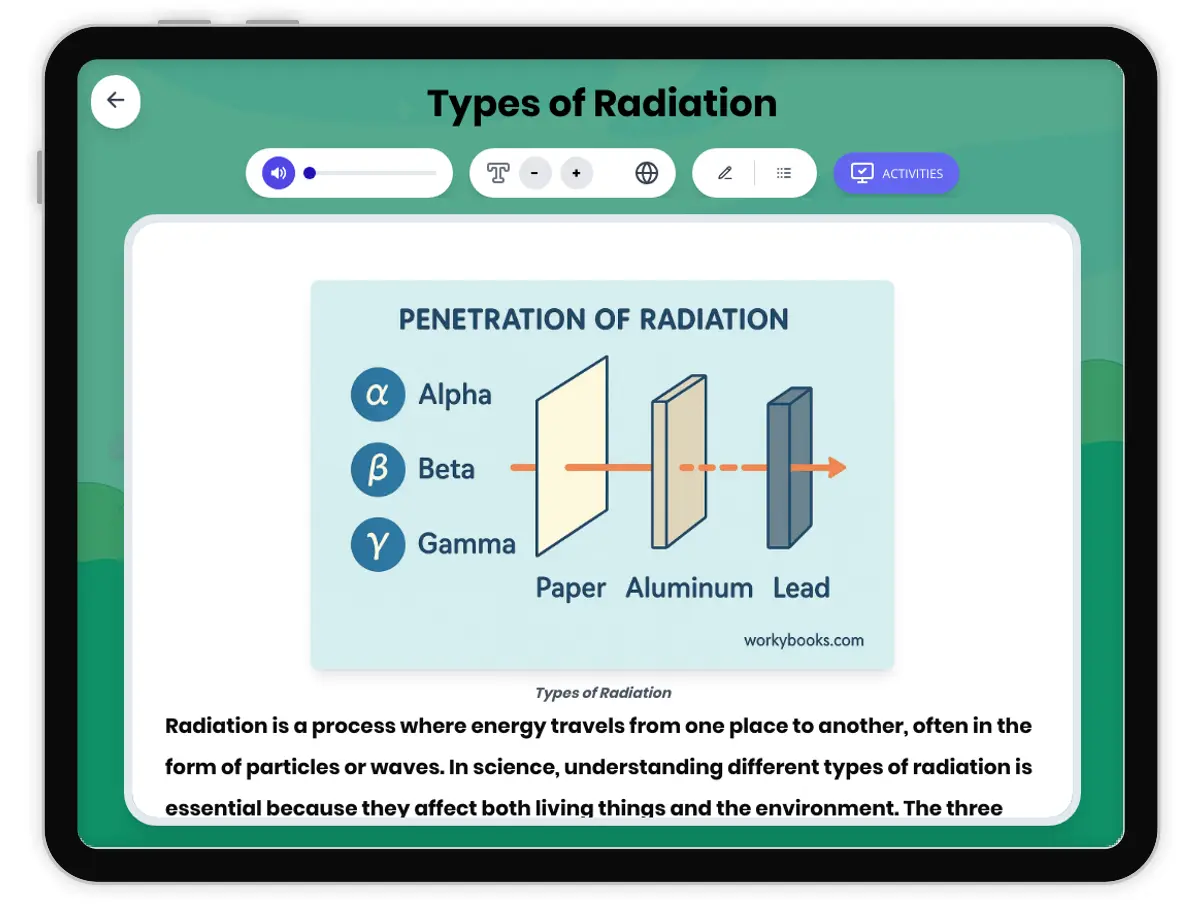This engaging science passage for grades 6-8 introduces students to the three main types of radiation: alpha particles, beta particles, and gamma rays. Aligned with NGSS MS-PS1-2, the text explores their structures, how each type interacts with matter, and their ionizing abilities. Students will learn about the effects of radiation on living organisms and how various materials protect us from different types of radiation. The passage also connects these scientific concepts to real-world problems, such as radiation in medical technology and environmental safety. Glossary terms are included to reinforce understanding, and the passage is available in both English and Spanish. Comprehension activities, writing prompts, and graphic organizers foster deeper learning. All resources are audio integrated for accessibility, making this a comprehensive tool for science classrooms.