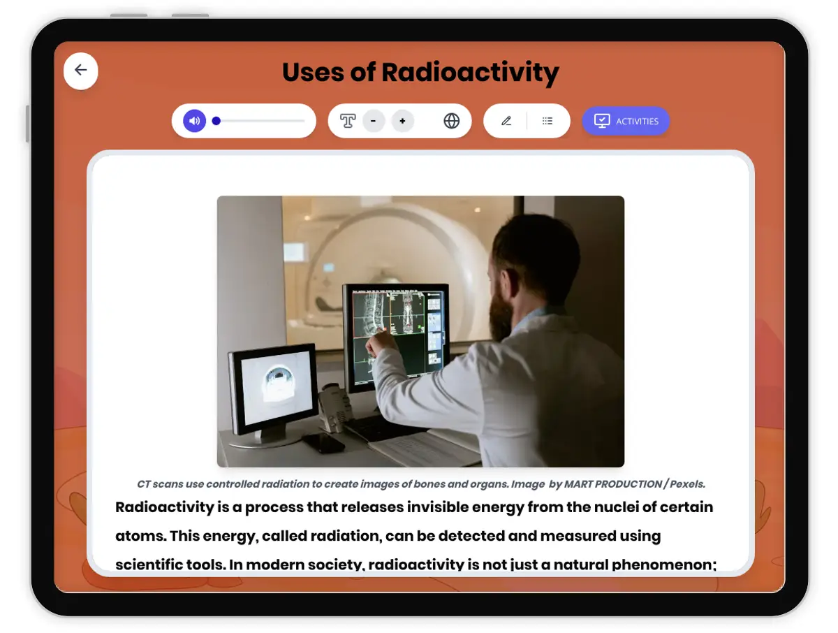 This comprehensive middle school science passage examines the uses of radioactivity, aligning with NGSS MS-PS1-1. Students will learn how radiation benefits society in various fields, including medical diagnostics and treatment (such as X-rays, CT scans, and cancer therapy), industrial applications (like thickness gauges and leak detection), agricultural pest control, food preservation, and scientific research (including dating fossils and artifacts). The passage explains the mechanisms behind these applications, such as how radioactive tracers work and why certain isotopes are effective tools. Real-world examples, such as smoke detectors using americium-241, illustrate cause-and-effect chains and the importance of safe, controlled use. The passage includes a glossary, differentiated version, Spanish translations, comprehension questions, writing prompts, and graphic organizers, all audio-integrated for accessibility. This resource is designed for grades 6-8, providing a clear connection to larger scientific principles and the disciplinary core idea. It is ideal for engaging students in understanding the positive impacts and considerations of radioactivity.