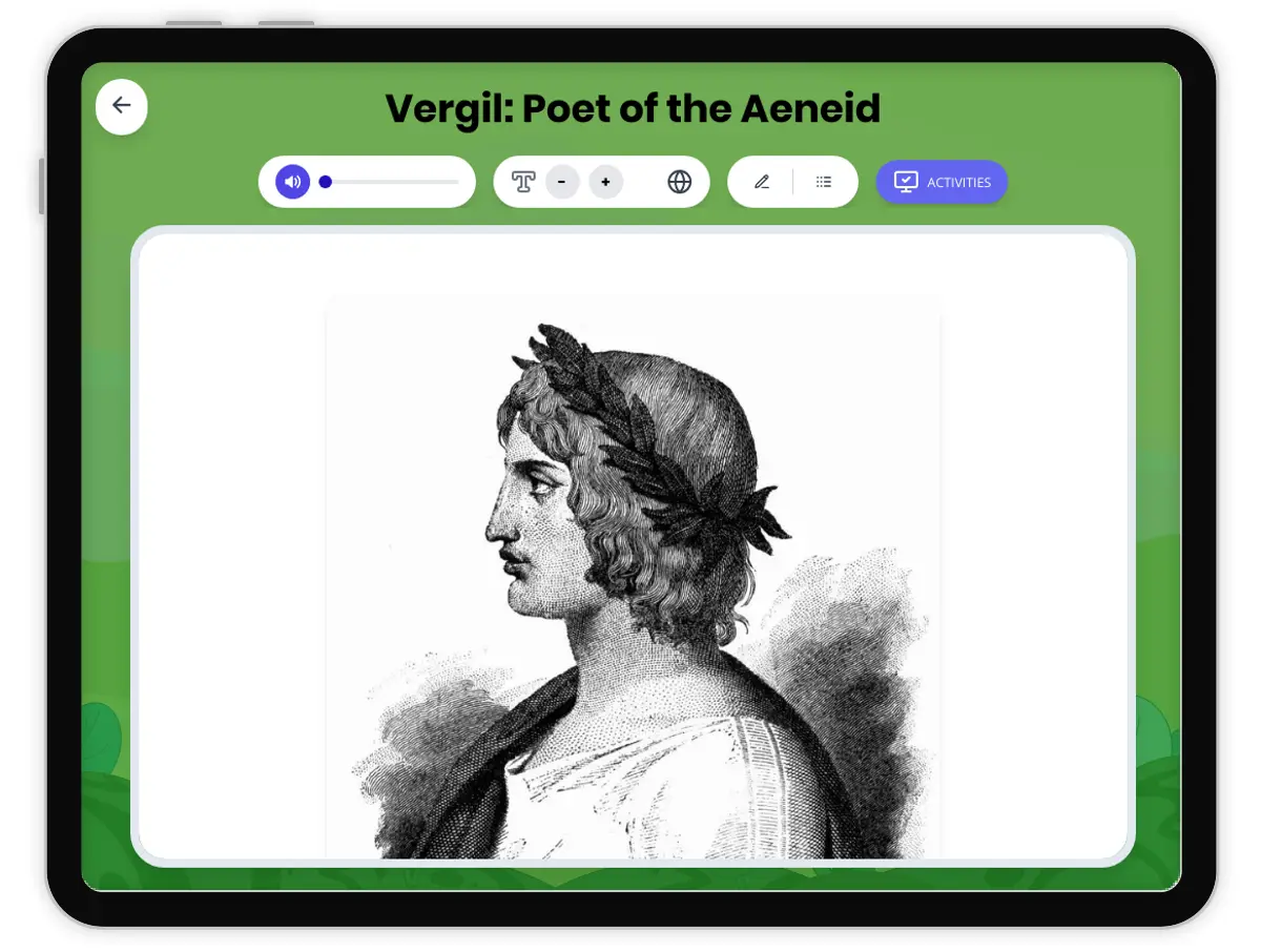 This passage explores the life and legacy of Vergil, the renowned Roman poet who authored the Aeneid, Rome's greatest epic poem. Students will learn about Vergil's background, the historical context of his writing, the impact of his work on Roman society, and the lasting influence of the Aeneid on world literature. The resource includes a comprehensive glossary, timeline of Vergil's life, reading comprehension questions, writing activities, and two graphic organizers to support historical thinking. A Spanish translation is provided for accessibility. The content aligns to history standards 6.7.8 and RH.6-8.1, meeting key requirements for historical analysis and Common Core reading skills. This educational reading passage is supported by a read aloud audio feature and is suitable for classroom or independent study. Keywords include Vergil, Aeneid, Ancient Rome, Roman poetry, and Latin literature, making it ideal for students studying world and ancient history.