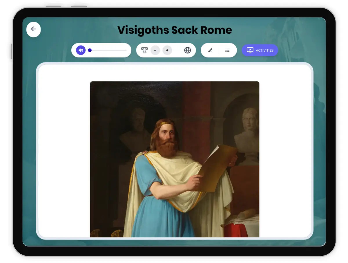 This educational history reading passage explores the 410 CE sack of Rome by Alaric and the Visigoths, highlighting its causes, events, and symbolic importance for the decline of the Western Roman Empire. Students will analyze primary sources, examine cause-and-effect relationships, and understand the broader impact of the event on European history. The passage is aligned with CA HSS 6.7.7 and CCSS RH.6-8.1-4 standards, and includes a glossary, multiple-choice quiz, differentiated reading versions, and Spanish translations. Graphic organizers and a timeline help students visualize key developments, while the included read aloud audio and vocabulary support all learners. This resource provides rigorous, accessible content for world history classrooms.