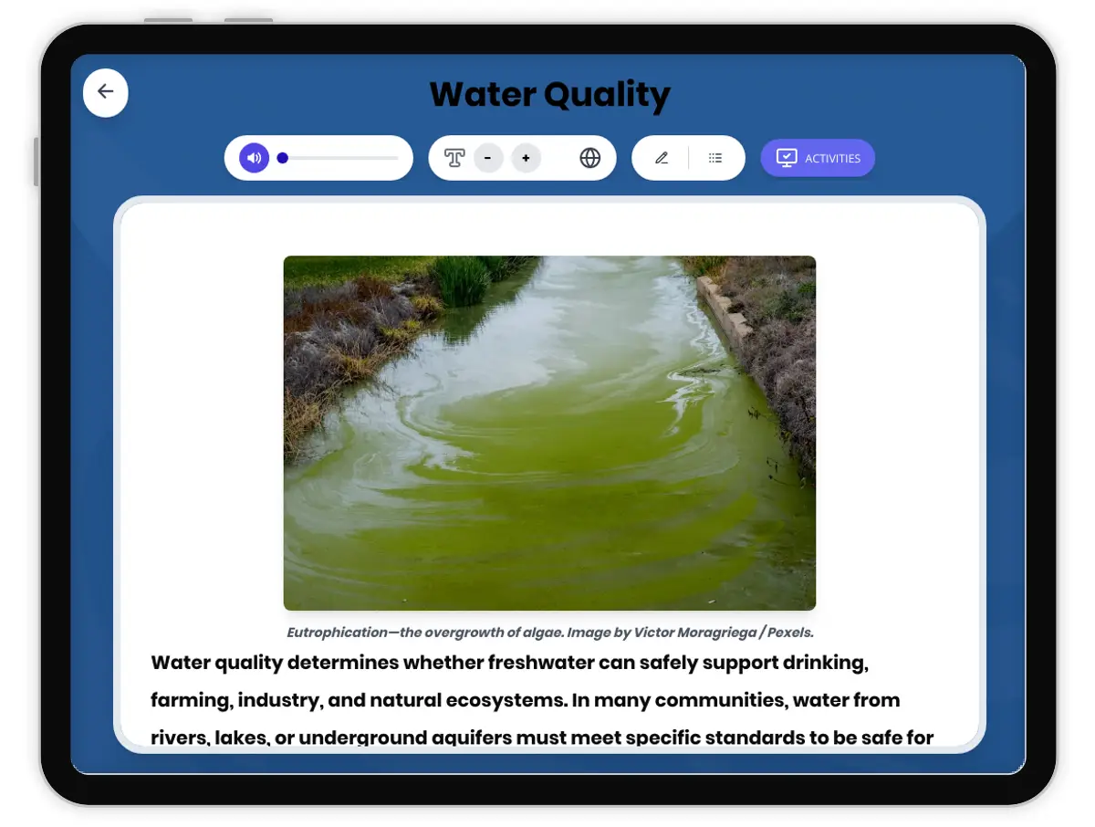 This middle school science reading passage covers the topic of water quality, aligned with NGSS standards MS-ESS3-1 and MS-ESS3-3. Students learn why clean water is essential for drinking, agriculture, industry, and ecosystems, and how different types of pollutants (such as pathogens, nutrients, toxic chemicals, sediments, and heat) affect freshwater sources. The passage explains the difference between point and nonpoint source pollution, how scientists measure water quality using dissolved oxygen, pH, turbidity, and biological indicators, and the role of water treatment and regulations like the Clean Water Act. Real-world examples and scientific thinking are integrated, helping students understand how protecting water quality supports public health and the environment. This resource includes audio integration for accessibility, a glossary, comprehension and writing activities, and graphic organizers to deepen understanding.
